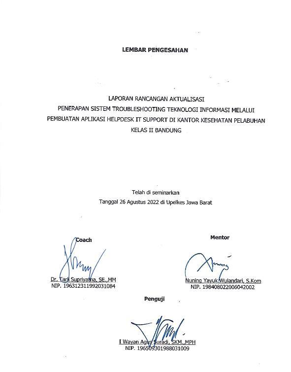 2022 di lingkungan tempat kerja yaitu Kantor Kesehatan Pelabuhan Kelas II Bandung, dengan mengaktualisasikan nilai-nilai dasar Berorientasi layanan, Akuntabel, Kompeten, Harmonis Loyal, Adaptif dan Kolaboratif yang berorientasi dalam bidang pelayanan IT Support di Kantor Kesehatan Pelabuhan Kelas II Bandung.