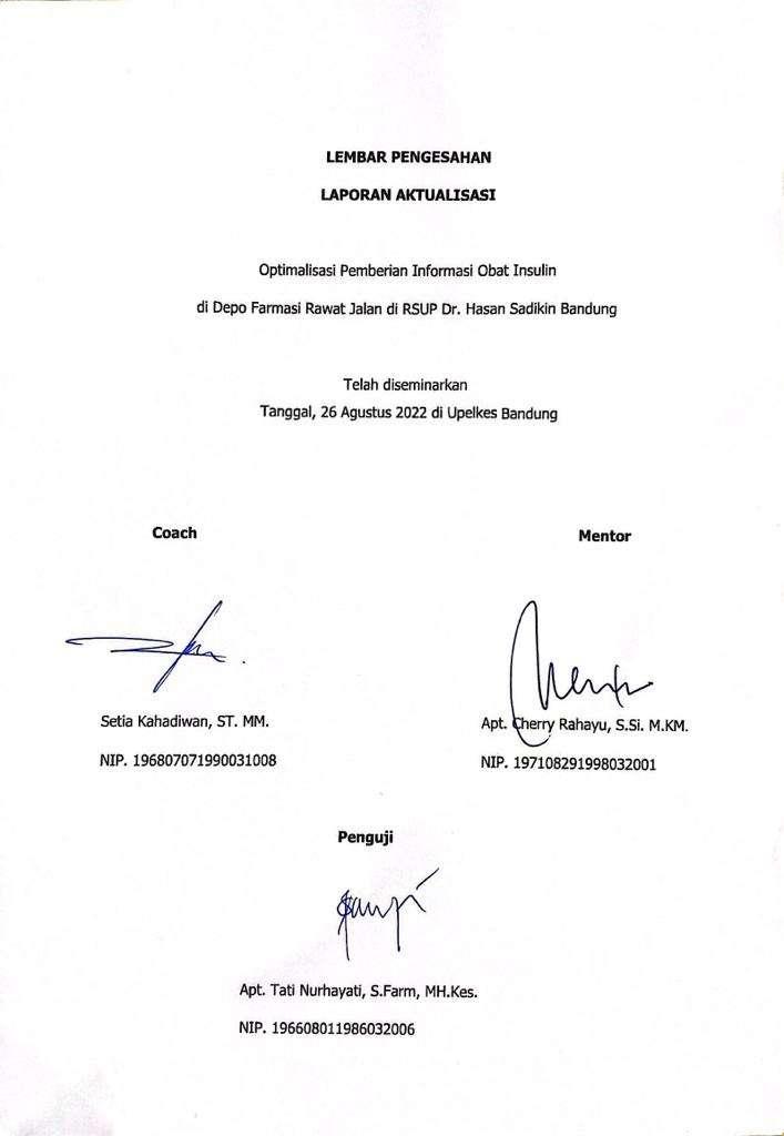 Pemberian Informasi Obat Insulin Injeksi di Depo Farmasi Rawat Jalan di RSUP Dr. Hasan Sadikin Bandung” telah berorientasi kepada pelayanan publik dan menerapkan nilai nilai dasar PNS yaitu BerAKHLAK pada pengerjaanya. Dengan optimalisasi pemberian informasi obat insulin injeksi diharapkan dapat meningkatkan efektivitas dan efisiensi serta mutu pelayanan pemberian informasi obat sehingga dapat meningkatkan kepuasan pasien dan menjaga citra baik instansi RSUP Dr. Hasan Sadikin Bandung.