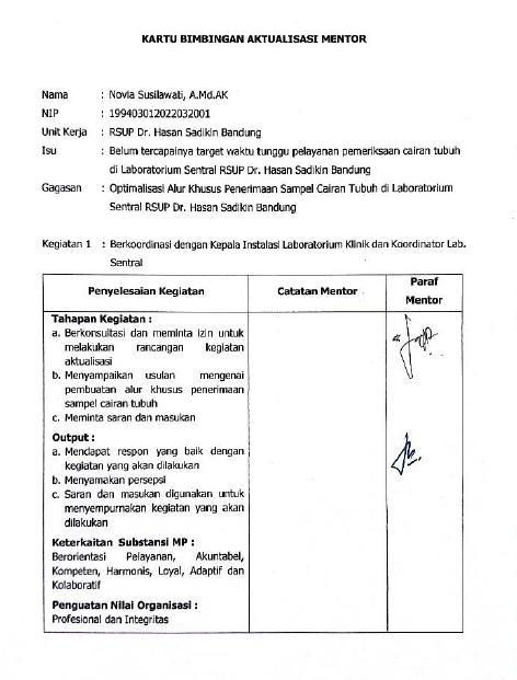 1. Ibu Dr. Delita Prihatni, dr., Sp.PK(K)., M.Kes., selaku Kepala Instalasi Laboratorium Klinik RSUP Dr. Hasan Sadikin Bandung sekaligus mentor yang senantiasa membimbing, memberikan dukungan dan arahan dalam melaksanakan kegiatan aktualisasi.