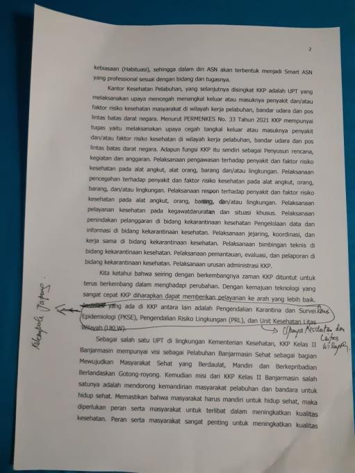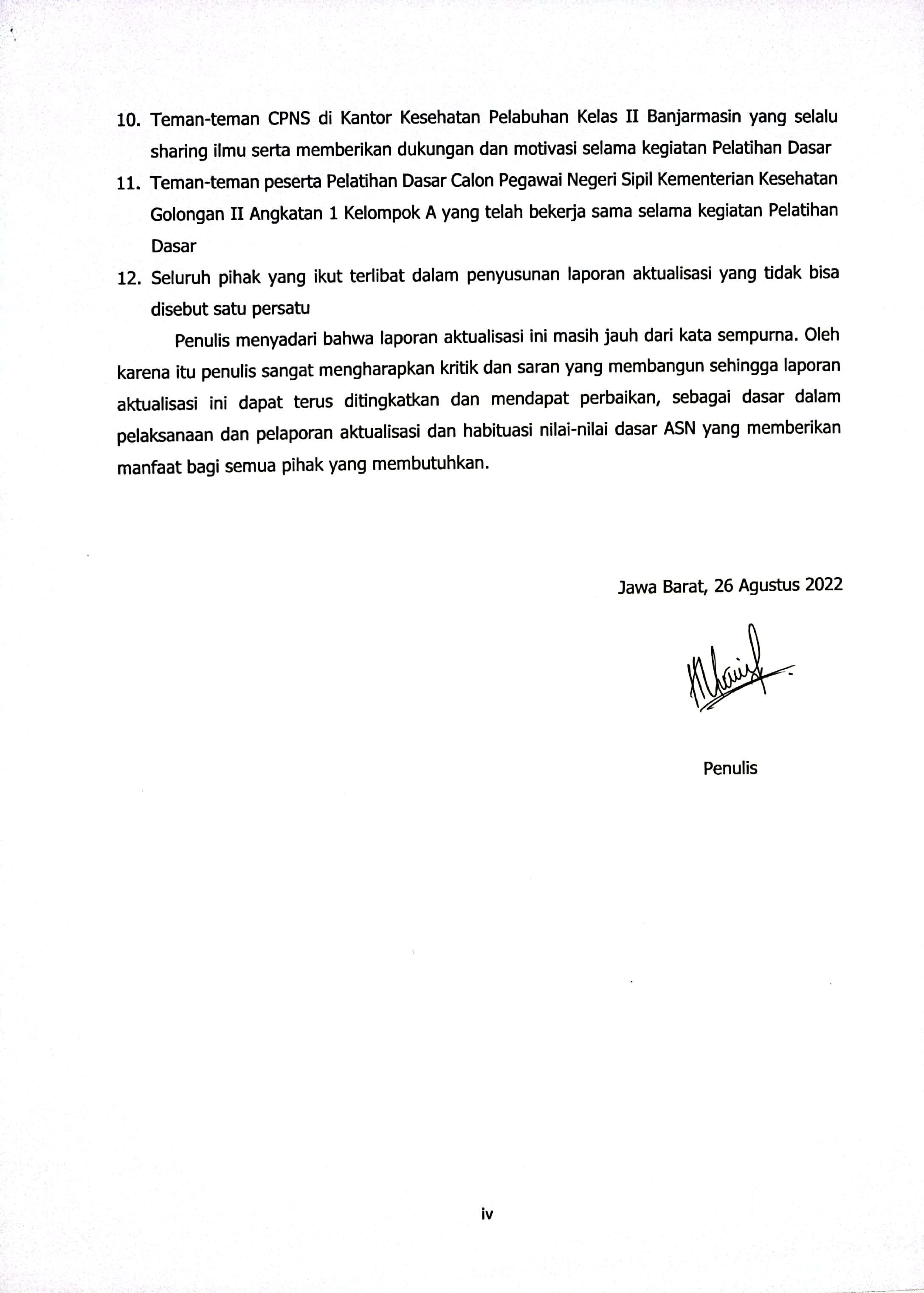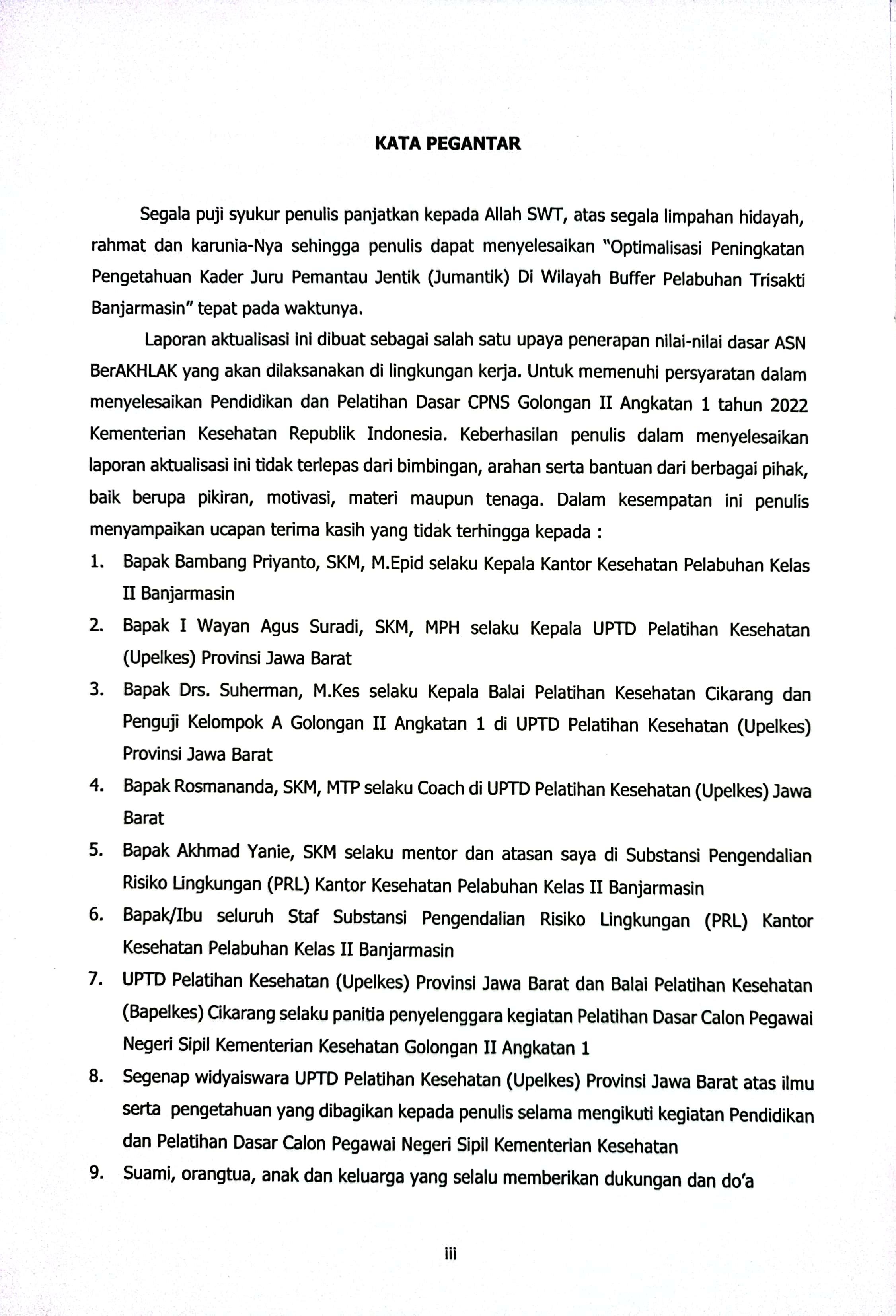Golongan II Angkatan I di Kementerian Kesehatan. Dengan menerapkan Nilainilai Dasar Aparatur Sipil Negara (ASN) dalam menjalankan tugas sebagai ASN di KKP Kelas II Banjarmasin dan sebagai wujud internalisasi nilai-nilai tersebut selama pendidikan dan Pelatihan Dasar CPNS di Upelkes Jawa Barat.