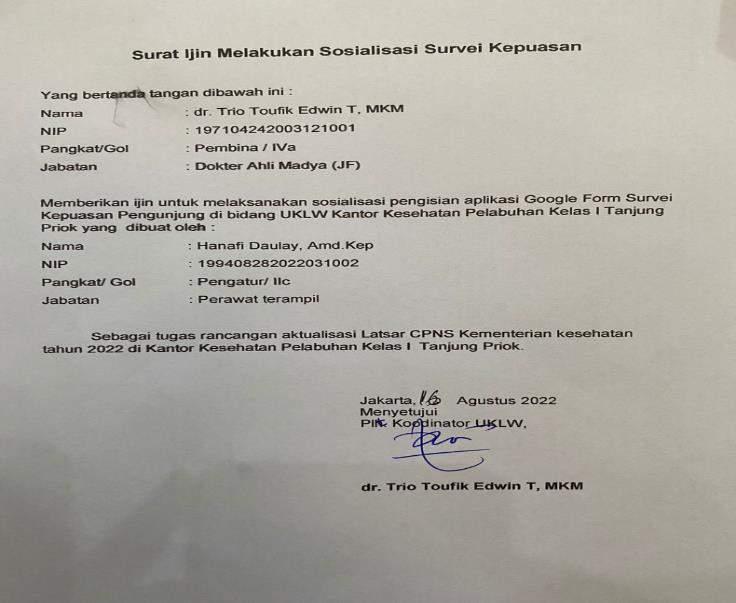 Melakukan sosialisasi aplikasi survey kepuasan pengunjung 1. meminta ijin atasan untuk mensosialisasikan aplikasi survey kepuasan Gbr. 1 ijin atasan 16 agustus 2022