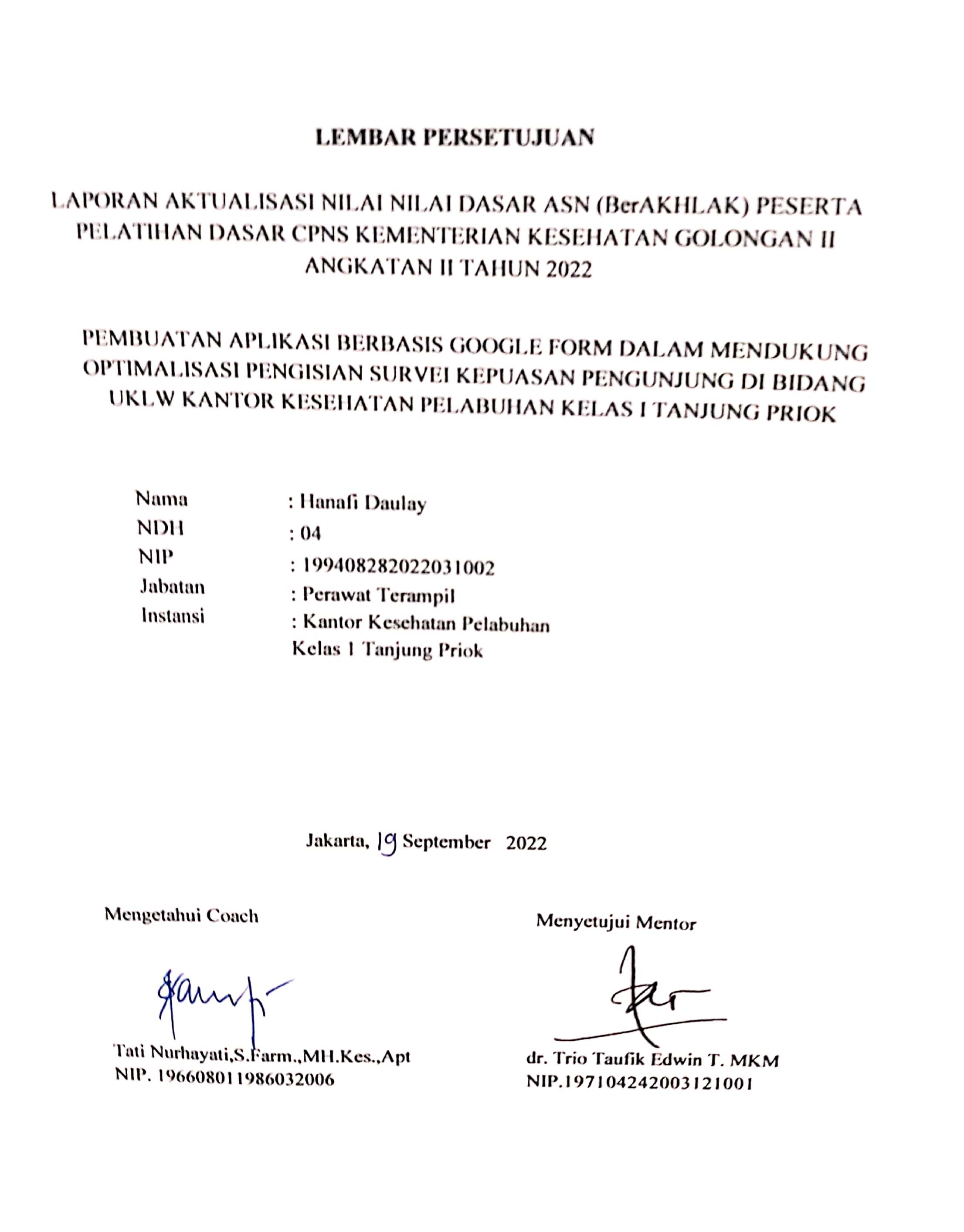 Puji dan syukur penulis panjatkan kepada Allah SWT, karena berkat rahmat dan hidayahNya penulis dapat menyelesaikan Rancangan Aktualisasi Nilai-Nilai Dasar ASN (BerAkhlak) yang berjudul “Pembuatan Aplikasi Berbasis Goegle Form Dalam Mendukung optimalisasi Survei Kepuasan Pengunjung di Bidang Uklw Kantor Kesehatan Pelabuhan Kelas 1 Tanjung