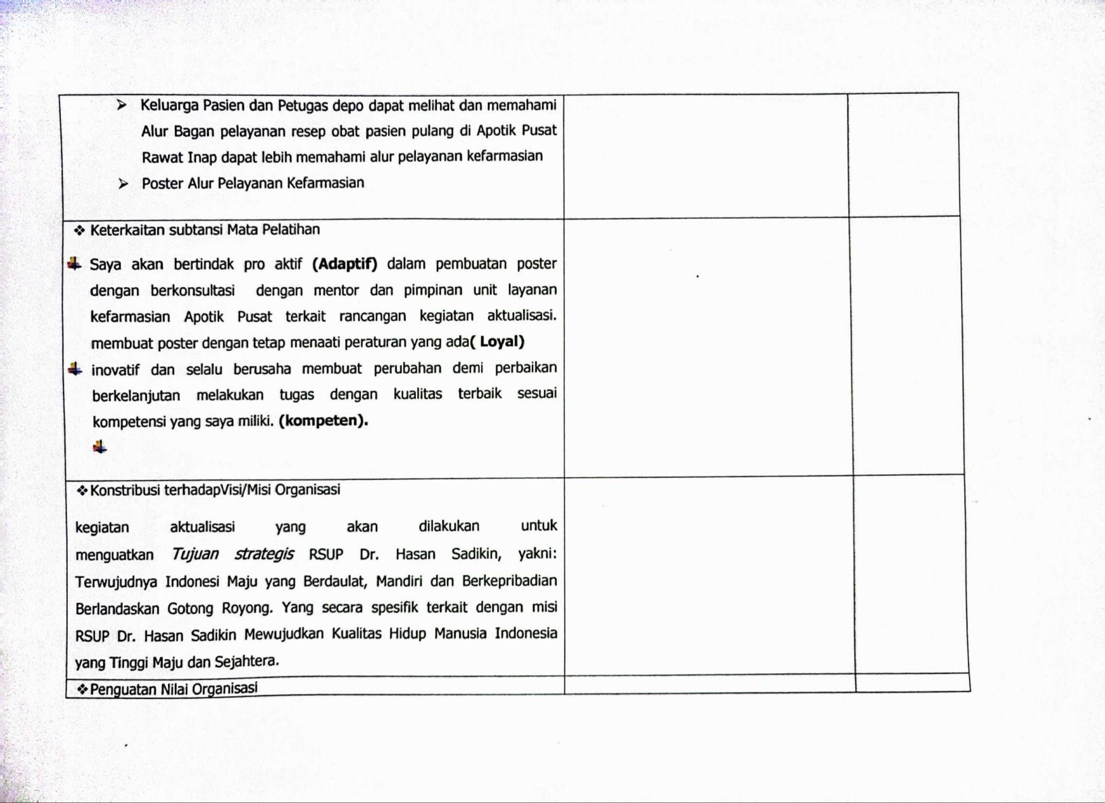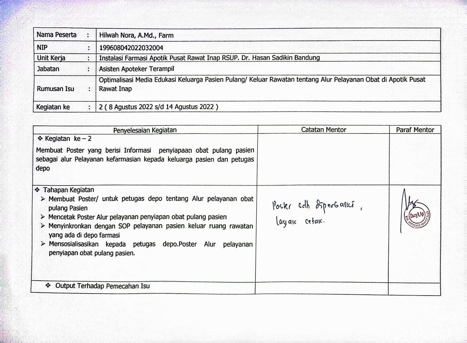 27 Juli 2022 – 6 September 2022. Dalam melakukan kegiatan aktualisasi ini, peserta sebagai asisten apoteker di RSUP. Dr. Hasan Sadikin Bandung mampu mengaktualisasi nilai-nilai dasar