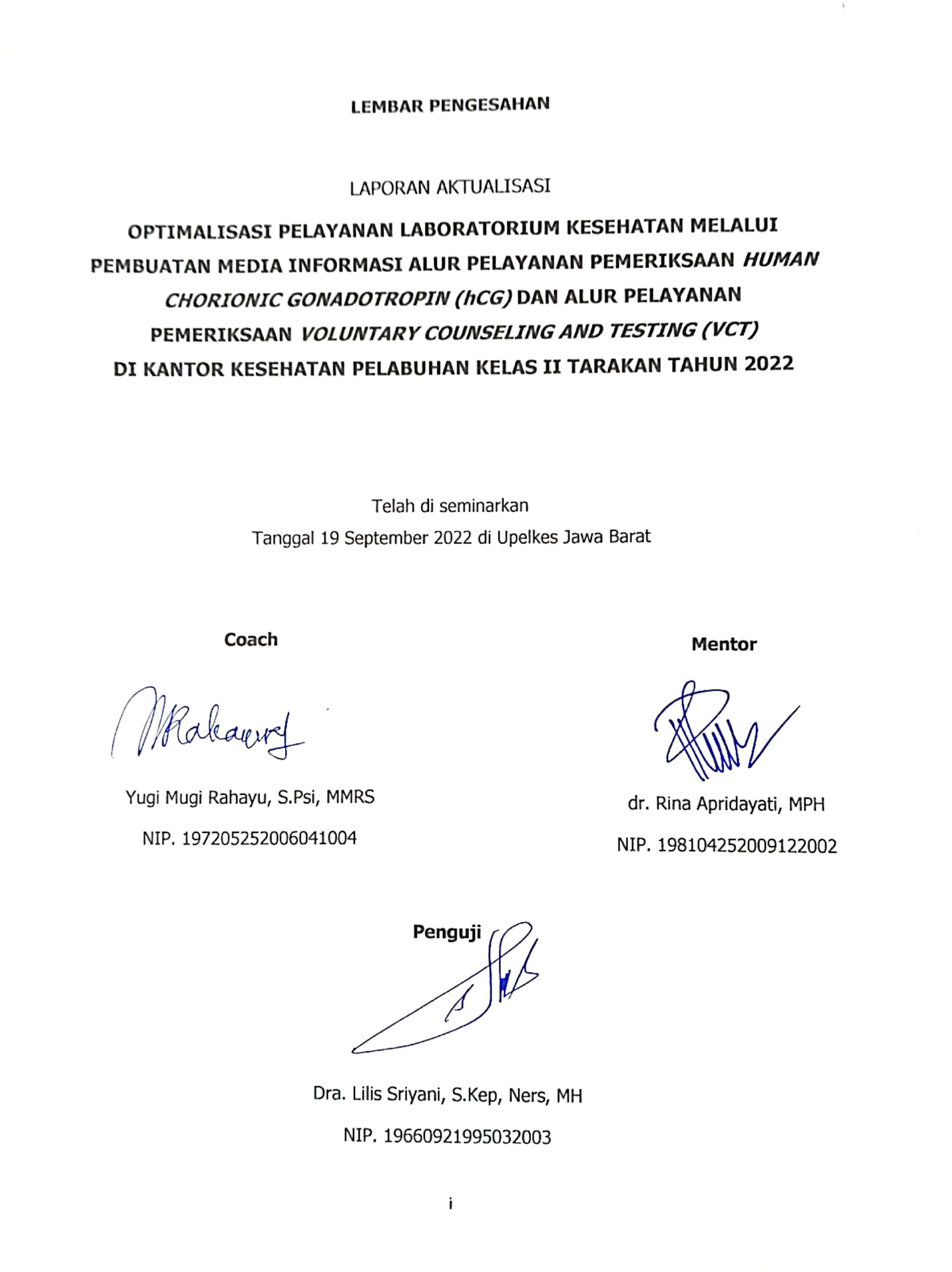 Hasil pelaksanaan aktualisasi yaitu pembuatan media informasi alur pelayanan pemeriksaan hCGdanpembuatan media informasi alur pelayanan pemeriksaan VCT dengan tujuan menngoptimalkan pelayanan laboratorium kesehatan di Kantor Kesehatan Pelabuhan Kelas II Tarakan.