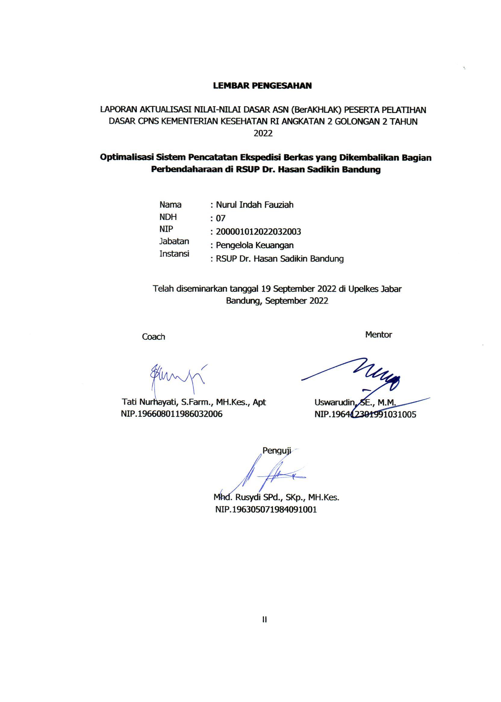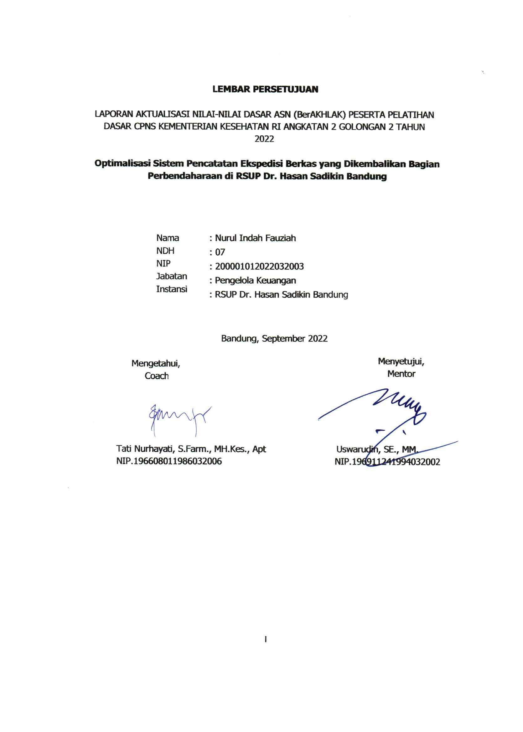 Puji dan syukur penulis panjatkan kepada Allah SWT, karena berkat rahmat dan hidayah-Nya penulis dapat menyelesaikan Rancangan Aktualisasi Nilai-Nilai Dasar ASN (BerAkhlak) yang berjudul “Optimalisasi Sistem Pencatatan Ekspedisi Berkas yang Dikembalikan Bagian Perbendaharaan di RSUP Dr. Hasan Sadikin Bandung” sebagai salah satu syarat untuk menyelesaikan Latihan Dasar CPNS Kementerian Kesehatan RI angkatan 2 golongan 2 Tahun 2022.