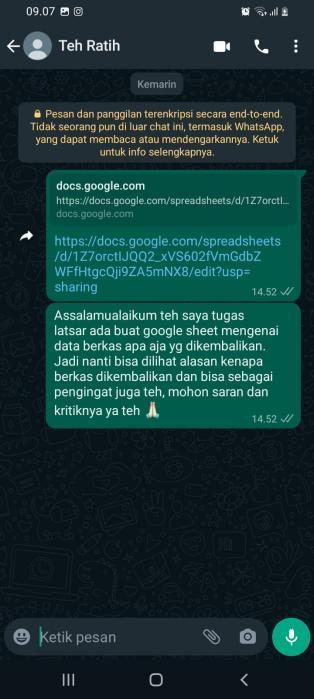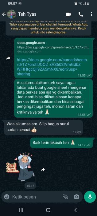 Efisien dalam waktu karena alasan pengembalian berkas bisa dilihat melalui googlesheet
