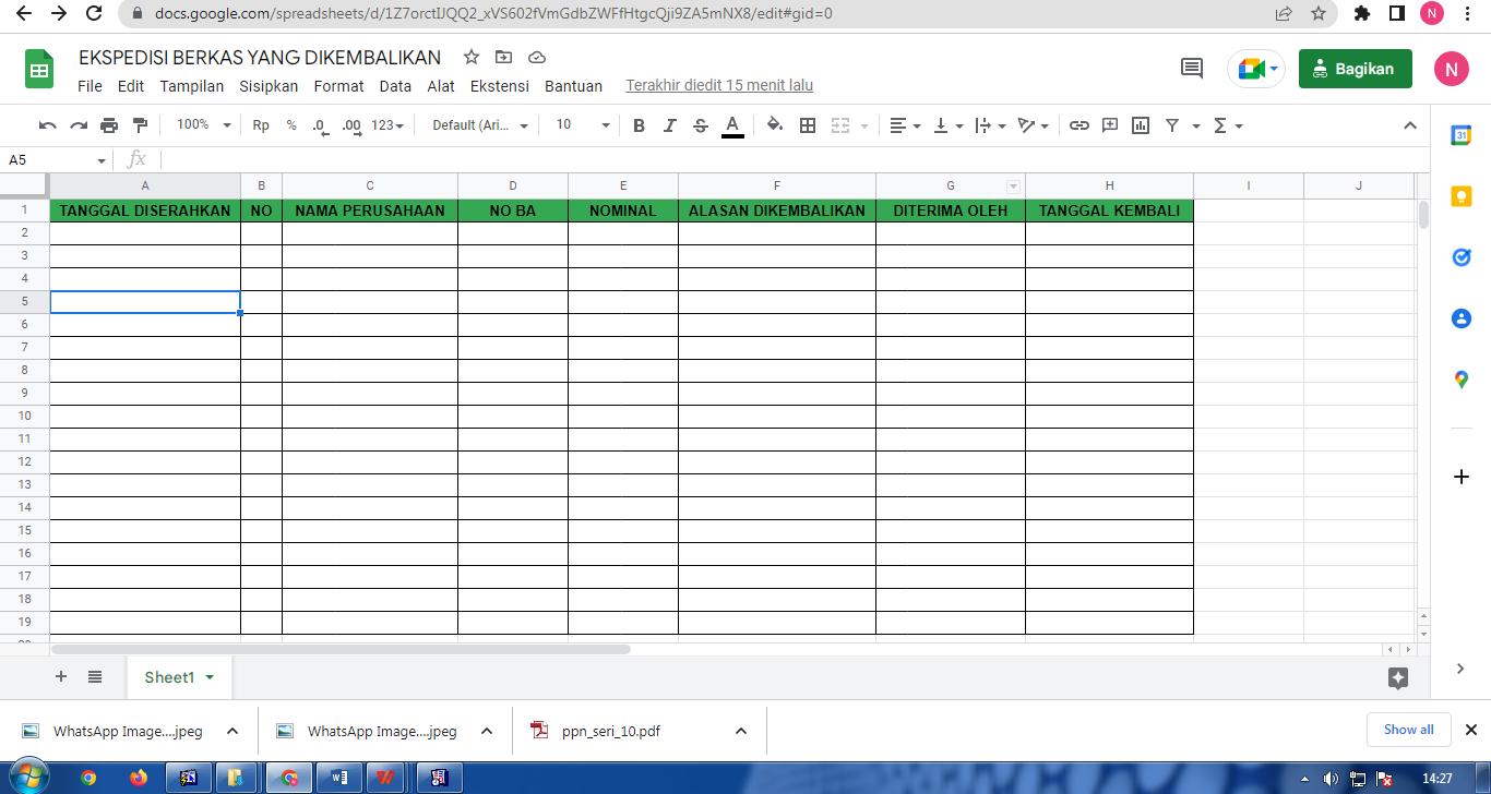 Kedua, penulis menyiapkan excel tersendiri sebagai dasar untuk mencatat di google sheet.Isi pada excel kurang lebih sama dengan yang ada di buku ekspedisi, hanya saja kolom tanda tangan diganti dengan kolom bagian yang menerima serta pada excel ditambahkan tanggal penyerahan setelah berkas selesai diperbaiki.