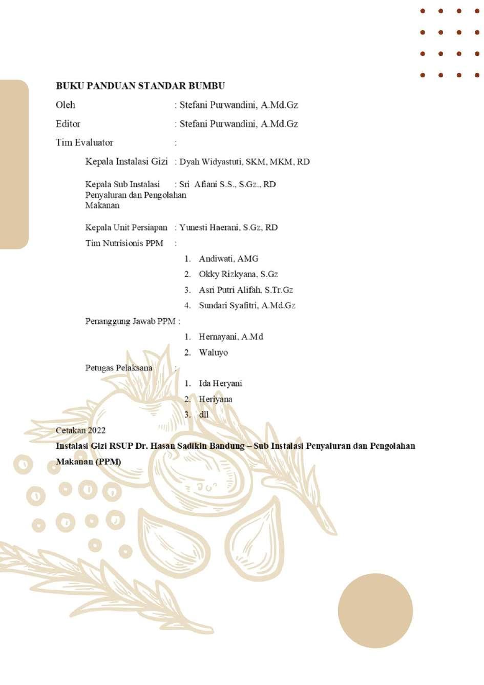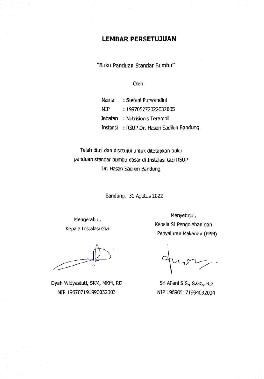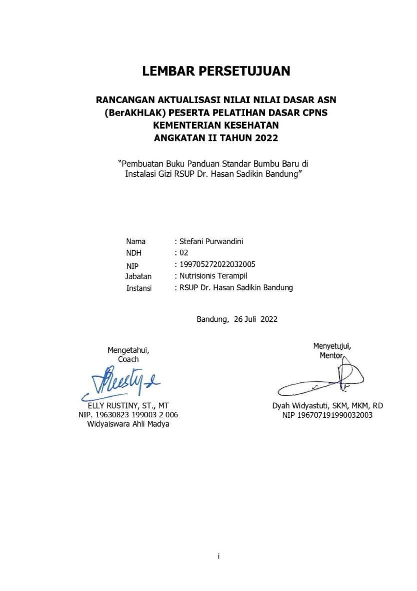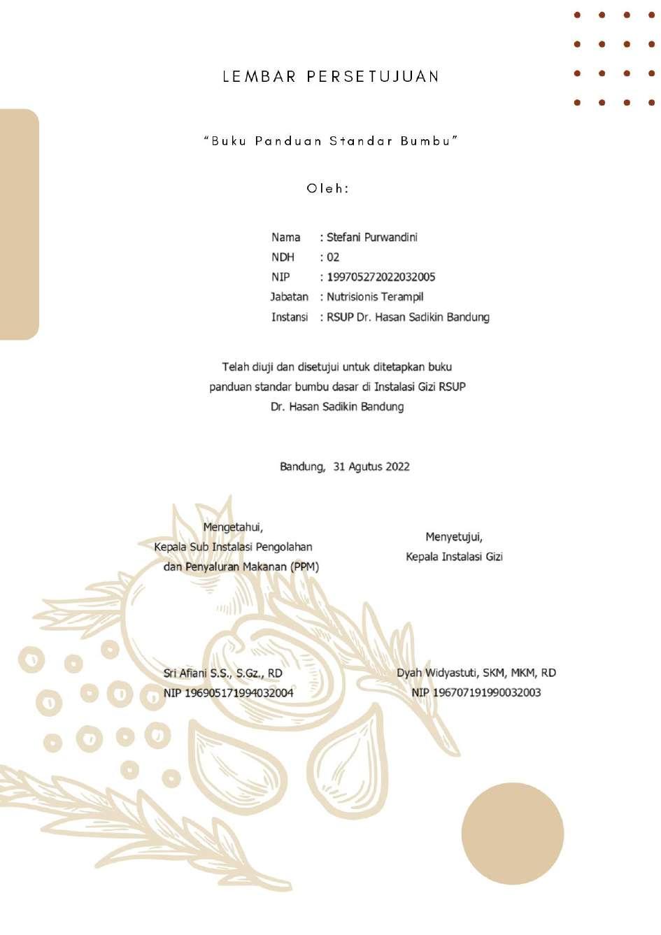 “Pembuatan Buku Standar Bumbu Baru di Instalasi Gizi RSUP Dr. Hasan Sadikin Bandung”. Laporan aktualisasi ini merupakan salah satu persyaratan dalam kegiatan latihan dasar Calon Pegawai Negeri Sipil yang harus dipenuhi sebelum diberikan penugasan langsung terkait bidang pekerjaan yang akan ditekuni selanjutnya.