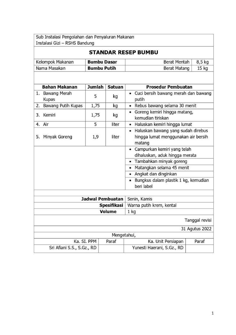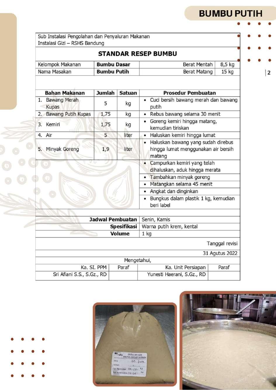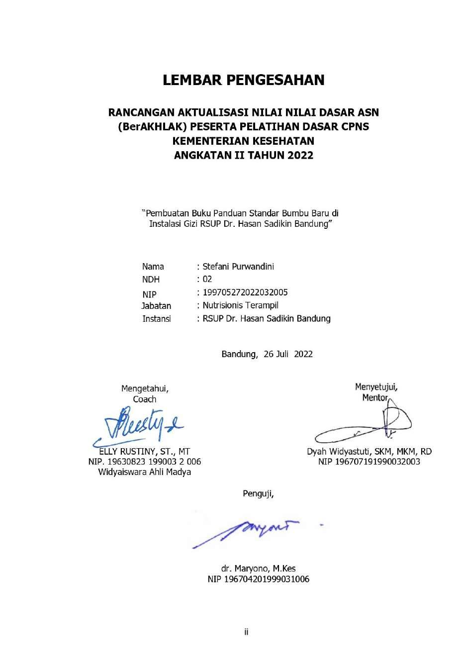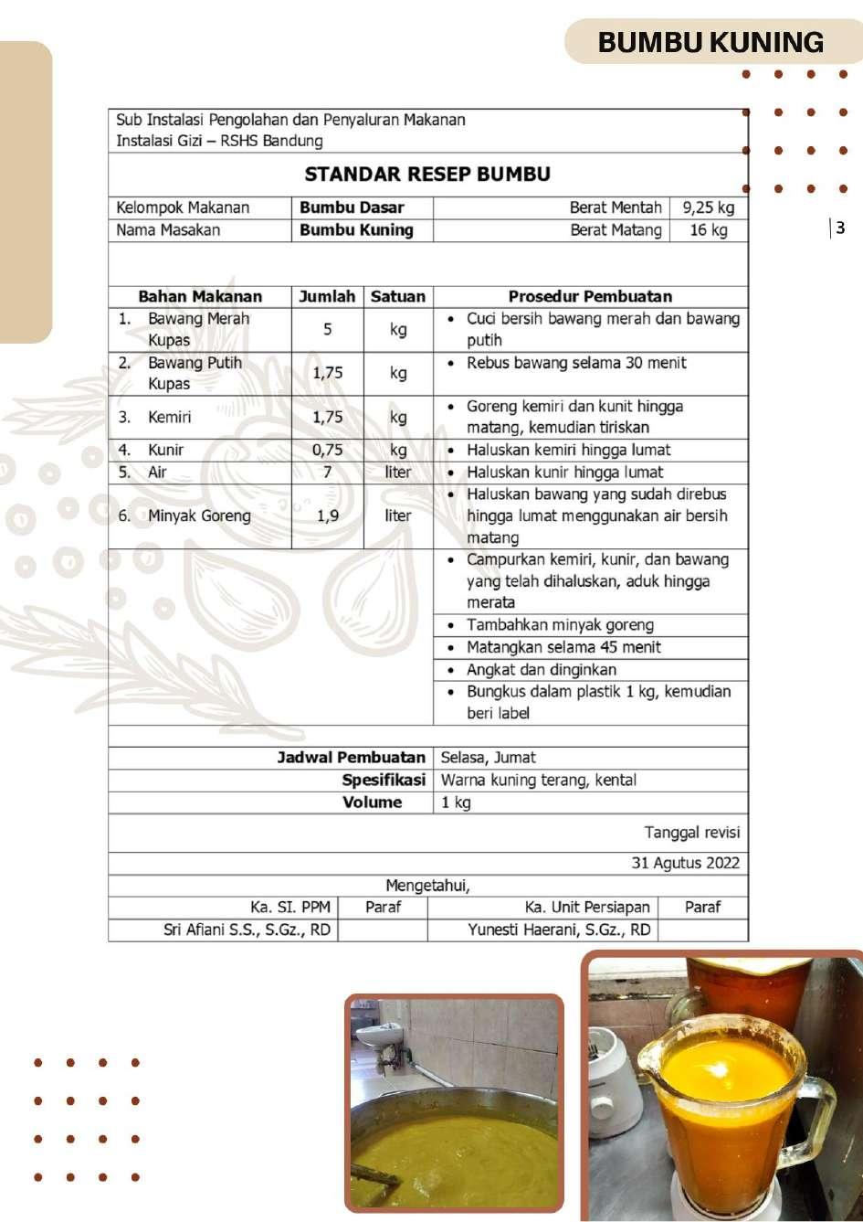 “Pembuatan Buku Standar Bumbu Baru di Instalasi Gizi RSUP Dr. Hasan Sadikin Bandung”. Laporan aktualisasi ini merupakan salah satu persyaratan dalam kegiatan latihan dasar Calon Pegawai Negeri Sipil yang harus dipenuhi sebelum diberikan penugasan langsung terkait bidang pekerjaan yang akan ditekuni selanjutnya.