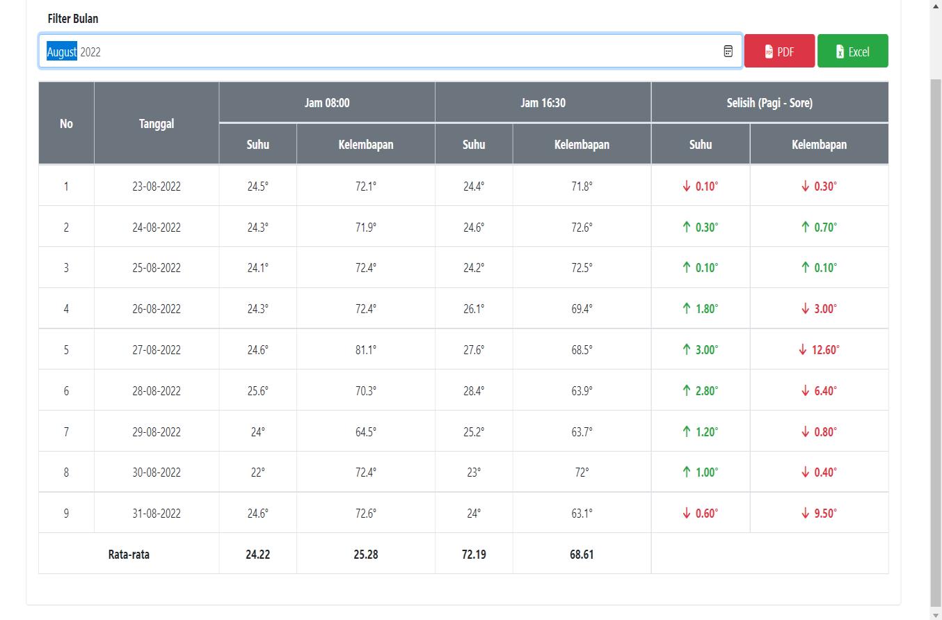 Dalam suatu Laboratorium hendaknya ada data tentang pencatatan suhu dan kelembaban yang terekam pada saat waktu pagi dan sore hari. Saat ini pencatatan dilakukan melalui onlinenamun masih keadaanrealtime.Hal inimenyebabkanpetugas memantau website yang menampilkan suhu dan kelembaban tersebut. Dengan adanya pengembangan dari sistem ini, hendaknya petugas hanya meliat hasil dalam bentuk excel karena sudah terekam secara otomatis dan terbaca di excel.