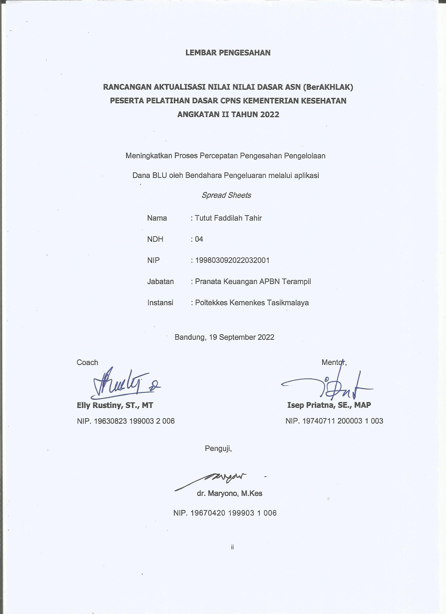 Penulisdapatbelajarberpikirkritisdanmengidentifikasiisuyangterjadidi lingkunganpekerjaankhususnyapadabagianKeuanganPoliteknikKesehatan KementerianKesehatanTasikmalayasehinggaPenulisberhasilmencarigagasan kreatifpemecahanisudengancaramembuatterobosanbaruyangdapat memberikanmanfaatsertaberhasilmenginternalisasikanCoreValuesASN BerAKHLAKsertamewujudhkanterciptanyaSmartASN.