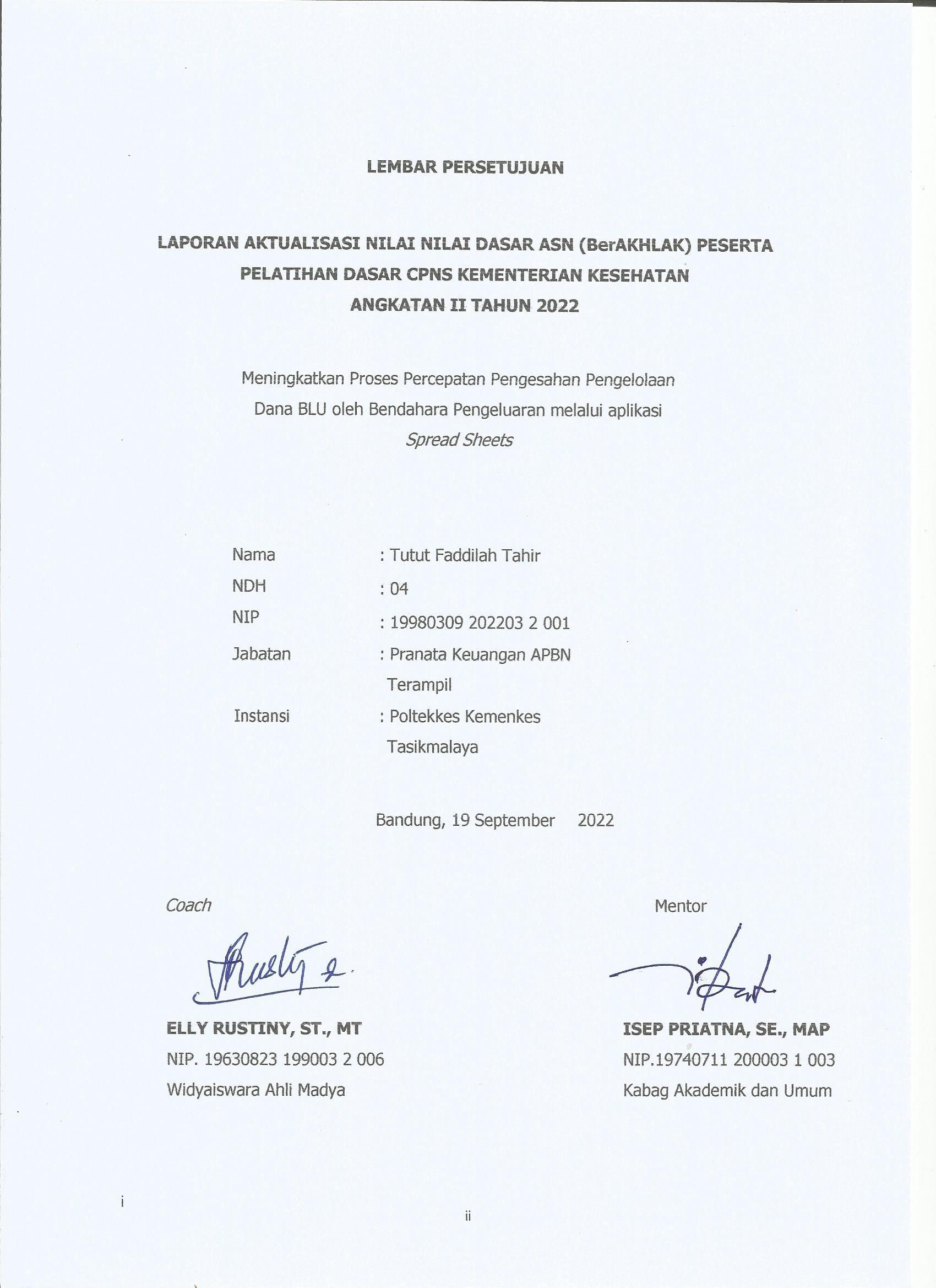 1 DAFTARISI LEMBARPERSETUJUAN i LEMBARPENGESAHAN.............................................................................................................................ii KATAPENGANTAR...................................................................................................................................iii DAFTARISI 1 DAFTARGAMBAR 3 DAFTARTABEL.........................................................................................................................................4 BABIPENDAHULUAN..............................................................................................................................5 11LatarBelakang.............................................................................................................................5 1.2TujuandanManfaat 6 1.3RuangLingkup 7 BABIIPROFILINSTANSI 8 2.1ProfilInstansi 8 2.1.1VisidanMisi....................................................................................................................10 212TugasPokokdanFungsiOrganisasi...........................................................................11 2.2ProfilPeserta 13 2.3SikapPerilakuBelaNegara 16 2.4Nilai-nilaiDasarASNBerAKHLAK 18 25KedudukandanPeranASNmenujuSmartGovernance......................................................19 2.6RoleModel 21 BABIIIRANCANGANAKTUALISASI....................................................................................................22 3.1DeskripsiIsu 23 3.1.1IsuKe-1:BelumoptimalnyapengelolaandanaBLUolehBendahara PengeluaransehinggaberdampakpadalambatnyaprosespengesahandanaBLU23 312IsuKe-2:BelumadanyaSOPyangjelasterkaitpembuatanSPTB.......................24 3.1.3IsuKe-3:Belumadanyapelatihanperpajakanbagipegawaidilingkup keuangan 24 3.2PenetapanCoreIsu..................................................................................................................25 3.3AnalisisFaktorPenyebabCoreIsu.........................................................................................27 3.4GagasanKreatifPenyelesaianCoreIsu.................................................................................28 3.5MatrikRancanganAktualisasi 29 3.6MatrikRekapitulasiRencanaHabituasiCoreValueASN(BerAKHLAK) 50 37RencanaJadwalKegiatanAktualisasi.....................................................................................51 BABIVCAPAIANKEGIATANAKTUALISASI 69 4.1RekepitulasiPelaksanaanKegiatanAktualisasi.....................................................................54 4.2DeskripsiCapaianKegiatanAktualisasi..................................................................................56 4.2.1Kegiatan1-PembuatanSpreadSheetsPengelolaanDanaBLU 56 4.2.2Kegiatan2-UjiCobaSpreadSheetsPengelolaanDanaBLU 59 4.2.3Kegiatan3-FinalisasiPembuatanSpreadSheetsPengelolaanDanaBLU..........60 4.3.4Kegiatan4-MonitoringRancanganAktualisasiSpreadSheetsPengelolaanDana 62 4.3AnalisisKemanfaaatandanDampakAktualisasi 63 4.3.1AnalisisKemanfaatan....................................................................................................63 432AnalisisDampakAktualisasi.........................................................................................63 4.4RekapitulasiAktualisasiNilai-NilaiBerakhlak 64 4.5RekapitulasiHabituasiCoreValuesASN(BerAKHLAK) 65 4.6RencanaTindakLanjut.............................................................................................................51