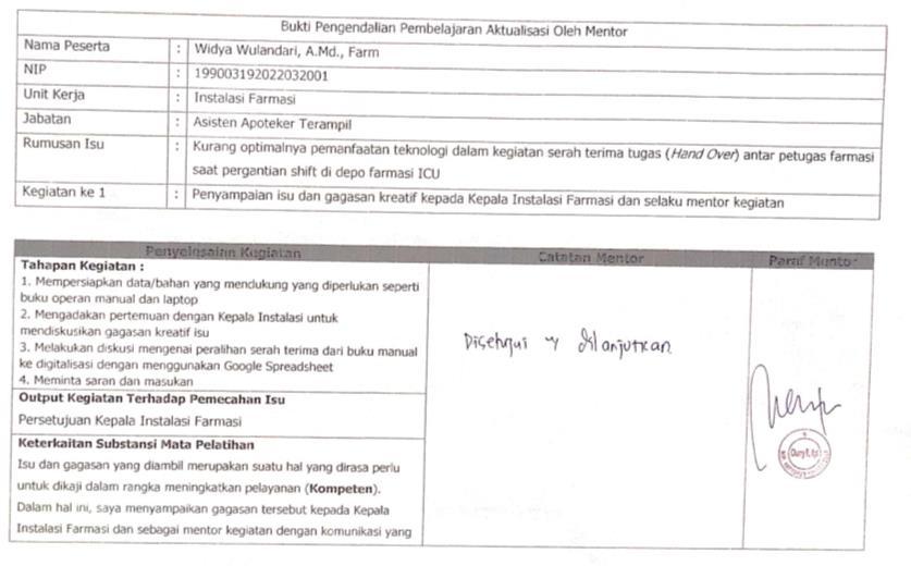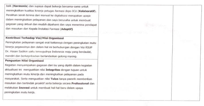 Pemanfaatan digitalisasi dalam kegiatan serah terima ini belum pernah dilakukan di depo farmasi ICU. Hal ini merujuk dari kegiatan yang sebelumnya menggunakan buku manual sebagai laporan serah terima tugas saat pergantian shift. Core Value ASN yang dominan dalam