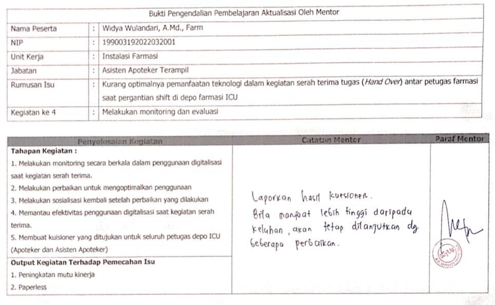 Kegiatan ini merupakan hal yang baru dilakukan di depo farmasi sehingga dapat membawa perubahan ke arah lebih baik. Kegiatan ini dapat meningkatkan efisiensi waktu dan data laporan serah terima dapat diarsip secara lebih rapi dan terstruktur serta meminimalisir penggunaan kertas dan buku (paperless) sehingga mengurangi beban rumah sakit dalam hal pengadaan buku. Laporan serah terima tugas merupakan kegiatan asuhan keperawatan terhadap pasien secara berkesinambungan dalam rangka pemenuhan kebutuhan pasien yang dirawat di ruang IntensiveCareUnit(ICU) dan NeonatalIntensiveCareUnit(NICU)Data pasien perlu diinput secara benar dan rinci supaya meminimalisir kejadian tidak diharapkan serta meningkatkan kualitas pelayanan terhadap pasien.