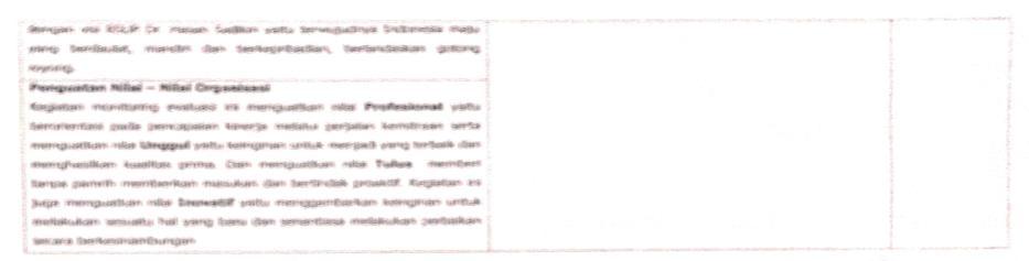 No Mata Pelatihan Kegiatan Jumlah Aktualisasi Per Mata Pelatihan Ke-1 Ke-2 Ke-3 Ke-4 Rencana Realisasi Rencana Realisasi Rencana Realisasi Rencana Realisasi Rencana Realisasi 1 Berorientasi Pelayanan 0 3 3 3 2 3 3 4 8 13 2 Akuntabel 0 2 4 3 2 3 0 3 6 11 3 Kompeten 2 2 1 2 1 3 3 4 7 11 4 Harmonis 2 3 0 3 2 2 0 3 4 11 5 Loyal 0 3 0 2 1 2 0 3 1 10 6 Adaptif 1 2 3 3 3 3 1 4 8 12 7 Kolaboratif 2 3 3 3 2 2 3 4 10 12 Jumlah Mata Pelatihan yang Diaktualisasikan per Kegiatan 7 18 14 19 13 18 10 25 44 80