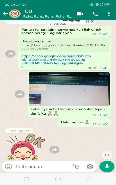 Antar Petugas Farmasi Saat Pergantian Shift Menggunakan Google Spreadsheetdi Depo Farmasi ICU