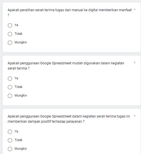 Peralihan kegiatan ini dari manual ke digitalisasi merupakan suatu bentuk pemanfaatan teknologi berbasis komputer yang dalam era seperti ini sangat memudahkan pekerjaan dan memiliki nilai efektifitas yang tinggi serta meminimalisir penggunaan buku dan kertas (paperless). Berdasarkan dari hasil survey melalui kuisioner yang dilakukan pada minggu ketiga telah didapatkan hasil terkait dengan dengan penggunaan digitalisasi dalam kegiatan serah terima tugas (HandOver) kepada seluruh petugas di depo farmasi ICU sebagai useratau pelaksana kegiatan. Survey melalui kuisioner ini dilaksanakan dengan menggunakan metode berbasis digital yaitu Google Formulir yang terdiri dari beberapa pertanyaan terkait dengan pelaksanaan kegiatan serta dampak yang dihasilkan terhadap pelayanan. Adapun pertanyaan yang dicantumkan dalam kuisioner kepada seluruh petugas depo farmasi ICU dengan jumlah 11 orang adalah sebagai berikut :