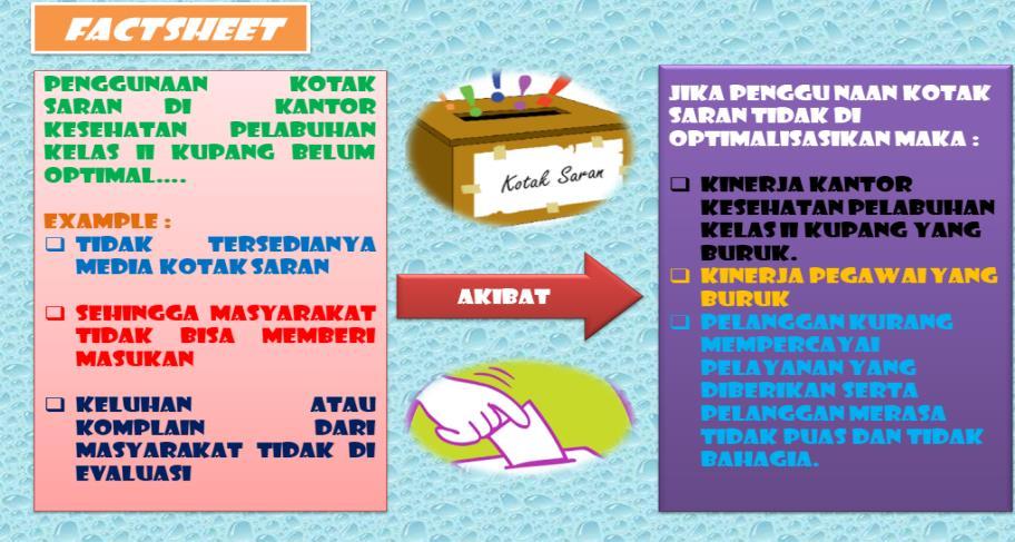 Gambar 2.1 Struktur Organisasi Kantor KesehatanPelabuhan Kelas II Kupang .......... 8 Gambar 3.1 Diagram Fish Bone 14 Gambar 5.1 Kontrak Waktu dengan Pimpinan ......................................................... 32 Gambar 5.2 Pertemuan dengan Pimpinan .............................................................. 32 Gambar 5.3 Presentasi Permasalahan ke Pimpinan 33 Gambar 5.4 Kegiatan Pasca Advokasi ..................................................................... 33 Gambar 5.5 Notulensi Kegiatan Konsultasi dan Advokasi 34 Gambar 5.6 Lembar Fakta .................................................................................... 35 Gambar 5.7 Belum Tersedianya Kotak Saran .......................................................... 35 Gambar 5.8 Pengambil Keputusan 36 Gambar 5.9 Sosialisasi Bersama Tim Humas ........................................................... 36 Gambar 5.10 Notulensi Kegiatan Membangun Tim Bersama Tim Humas ................... 37 Gambar 5.11 Pembaharuan Kotak Saran 37 Gambar 5.12 Kegiatan Koordinasi dengan Mentor dan Koordinator Humas ................ 38 Gambar 5.13 Notulensi Kegiatan Menyiapkan bahan Materi SKM .............................. 39 Gambar 5.14 Konsultasi Via Whatsapp RancanganDigitalisasi SKM 40 Gambar 5.15 Langkah-langkah dalam Membuat Digitalisasi SKM .............................. 40 Gambar 5.16 Survey Kepuasan masyarakat dalam bentuk Barcode dan Tautan ......... 42 Gambar 5.17 Sosialisasi Kepada Masyarakat untukMengakses SKM 42 Gambar 5.18 Sosialisasi Kepada Petugas Kantor untuk Mengakses SKM .................... 43 Gambar 5.19 Evaluasi Ujicoba Digitalisasi SKM bersama Tim Humas Via Daring ......... 43 Gambar 5.20 Notulensi Evaluasi Digitalisasi SKM 45 Gambar 5.21 Pengaplikasian Pemasangan Barcodedi Kantor ................................... 46 Gambar 5.22 Membagikan Barcode &Tautan Ke Wilker untuk di aplikasikan ............. 47 Gambar 5.23 Monitoring dan Evaluasi Hasil Penerapan Inovasi 48 Gambar 5.24 Rekapan Monitoring dan Evaluasi Hasil Penerapan Inovasi ................... 49 Gambar 5.25 Lembar Hasil Monitoring Dan Evaluasi ................................................ 50 ..................................................................................................................................39