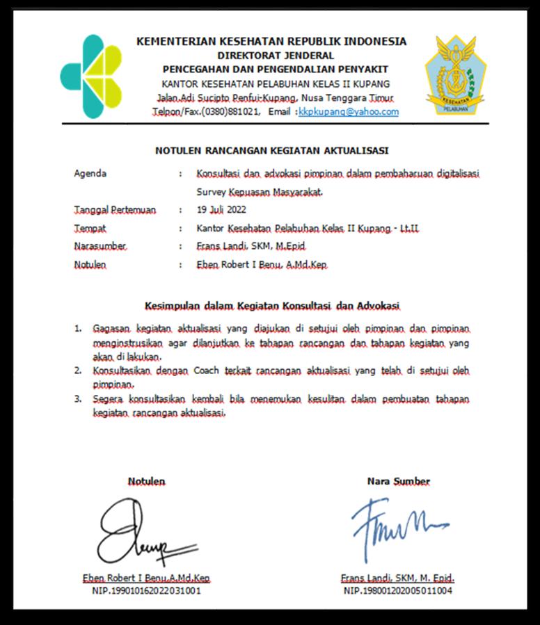 Laporan laporan aktualisasi ini disusun dalam rangka memecahkan isu yang ada di unit kerja Kantor Kesehatan Pelabuhan Kelas II Kupang dengan mengaktualisasikan nilainilai BerAKHLAK serta menerapakan kedudukan dan peran ASN dalam mewujudkan smart governance.