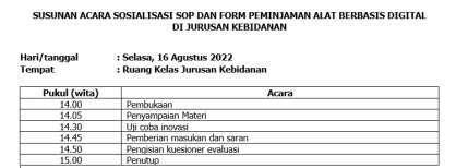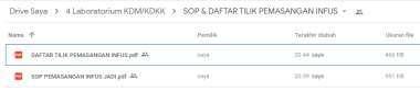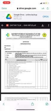 Gambar 3.1. Form Peminjaman Alat 22 Gambar 3.2. Daftar Tilik KDKK……………………………………………………………….. 22 Gambar 3.1. Diagram Tulang Ikan………………………………………………………….. 23 Gambar 5.1. Lembar Konsultasi Aktualisasi……………………………………………… 30 Gambar 5.2. Foto Konsultasi dengan Pihak Terkait 32 Gambar 5.3. SOP Laboratorium Poltekkes Mataram .. 34 Gambar 5.4. Draft SOP Keterampilan Lab kelas KDKK . 35 Gambar 5.5. Akun Gmail Laboratorium Kebidanan……………………………………. 36 Gambar 5.6. Akun Google Drive Laboratorium Kebidanan…………………………. 36 Gambar 5.7. Foto Proses Membuat Akun Google 36 Gambar 5.8. SOP Keterampilan yang telah divalidasi 38 Gambar 5.9. Scan SOP yang telah direvisi .. 38 Gambar 5.10. Hasil Upload SOP ke Google Drive……………………………………… 40 Gambar 5.11. Konsultasi dan Proses Pembuatan Form 42 Gambar 5.12. Google Form Peminjaman Alat 43 Gambar 5.13. Standar Alat pada SOP 44 Gambar 5.14. Daftar Alat di Gform…………………………………………………………. 46 Gambar 5.15. Konsultasi dengan Mentor dan Kajur dan Korda Dua……………. 47 Gambar 5.16. Proses Pembuatan QR Code . 49 Gambar 5.17. Draft Flipchart QR Code SOP 49 Gambar 5.18. Aplikasi QR and Barcode Scanner………………………………………. 50 Gambar 5.19. Tahapan scan SOP Laboratorium Polkesram……………………….. 51 Gambar 5.20. Tahapan scan SOP Keteampilan KDKK 51 Gambar 5.21. Tahapan Scan Format Peminjaman Alat 52 Gambar 5.22. Berdiskusi dengan Tim PLP……………………………………………….. 53 Gambar 5.23. Flipchart SOP…………………………………………………………………… 54 Gambar 5.24. Susunan acara sosialisasi………………………………………………….. 55 Gambar 5.25. Nota dinas sosialisasi 56 Gambar 5.26. Foto sosialisasi dengan Dosen dan PLP . 57 Gambar 5.27. Membagikan Link PDF ……………………………………………………… 58 Gambar 5.28. Daftar hadir dosen dan PLP……………………………………………….. 58 Gambar 5.29. Foto sosialisasi pada mahasiswa 58 Gambar 5.30. Form Evaluasi Dosen dan mahasiswa . 60 Gambar 5.31. Membagikan link evaluasi pada peserta sosialisasi………………. 60 Gambar 5.32. Link Google Sheets…………………………………………………………… 60 Gambar 5.33. Hasil evaluasi Dosen dan PLP 61 Gambar 5.34. Hasil evaluasi Mahasiswa 63