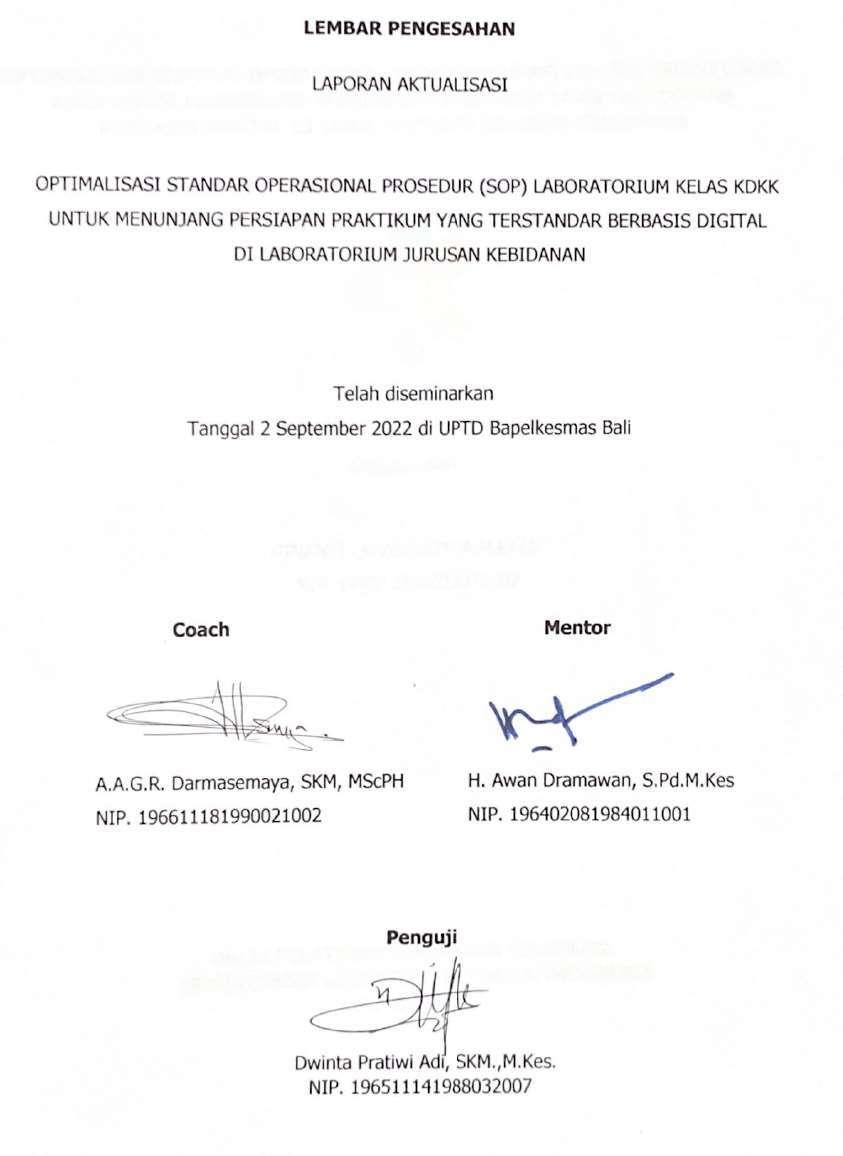 Standar Operasional Prosedur (SOP) Laboratorium Kelas KDKK untuk Menunjang Persiapan Praktikum yang Terstandar Berbasis Digital di Laboratorium Jurusan Kebidanan” tepat pada waktunya. Laporan aktualisasi ini disusun dalam rangka memecahkan isu yang ada di satuan