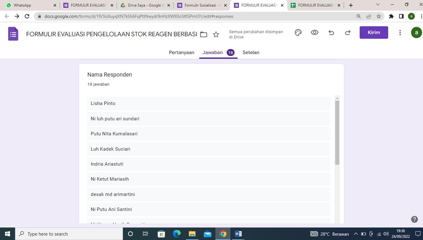 “Pengelolaan stok reagen diperlukan untuk tertib dalam pemakaian, pemantauan dan distribusi. Hal ini diperlukan sebagai bentuk pertanggung jawaban terhadap reagen yang telah disediakan. Untuk proses tersebut, dengan dibuat pengelolaan stok reagen berbasis google sheets akan memudahkan dalam pertanggungjawaban terhadap pengelolaan reagen yang saat ini masih dilakukan secara manual. Untuk lebih optimalnya aplikasi ini perlu disosialisasikan setiap saat pada petugas ”