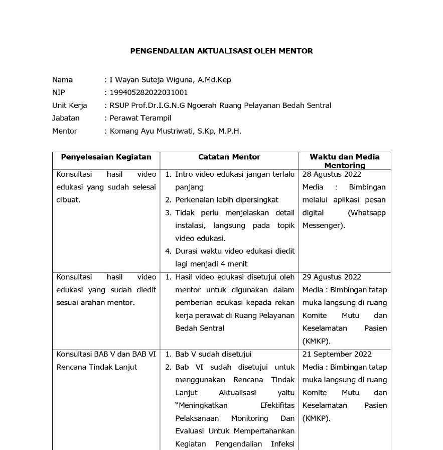 3. Ibu Komang Ayu Mustriwati, S.Kp., M.P.H. selaku Mentor yang senantiasa memberikan bimbingan dan masukan dalam penyusunan laporan aktualisasi ini.