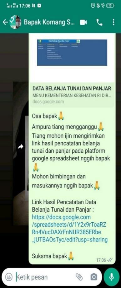 Gambar 5.20 Pelaporan link hasil pencatatan belanja tunai dan panjar pada platform google spreadsheet....................................................................................................................80
