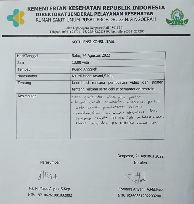 b. Kegiatan kedua yaitu menyusun video dan poster tentang restrain sesuai SOP dan ceklist pemantauan pasien restrain, kemudian melakukan koordinasi dengan mentor dan instalasi PKRS yang telah menerapkan nilai nilai dasar BerAKHLAK yaitu Akuntabel, Kompeten, Harmonis, Adaptif dan Kolaboratif. Selain itu, kegiatan ini sejalan dengan Visi RSUP Prof. DR.I.G.N.G. Ngoerah yaitu Menjadi Rumah Sakit Unggul dan Mandiri Tahun 2024 dan misi Menciptakan tata kelola RS yang baik dan Membangun Jejaring Kesehatan dan Kerjasama Dengan Pemangku Kepentingan Terkait serta memberi penguatan pada nilai-nilai organisasi yaitu Profesional dan Tat Twan Asi.