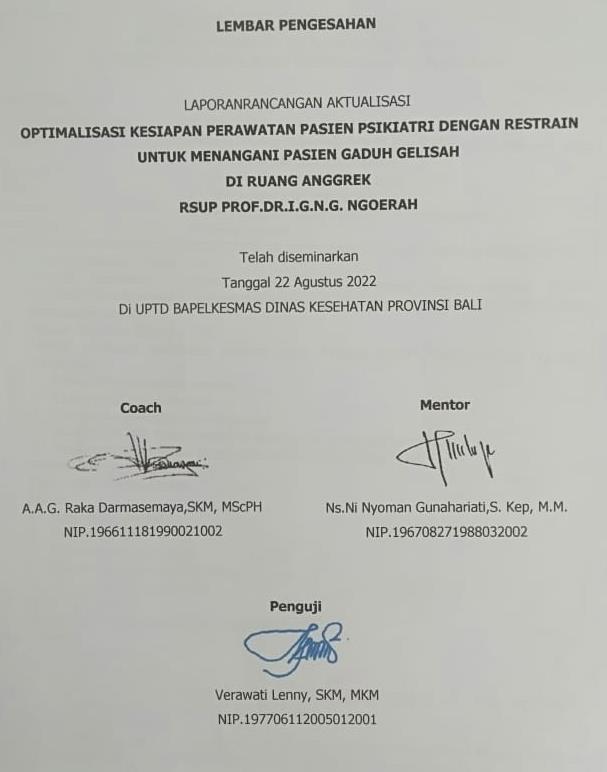 “Optimalisasi Kesiapan Perawatan Pasien Psikiatri Dengan Restrain Untuk Menangani Pasien Gaduh Gelisah Di Ruang Anggrek RSUP Prof.DR.I.G.N.G. Ngoerah” tepat pada waktunya. Laporan rencana aktualisasi ini disusun dalam rangka memecahkan isu yang ada di satuan kerja CPNS dengan mengaktualisasikan nilai-nilai dasar PNS yaitu BerAKHLAK (Berorientasi Pelayanan, Akuntabel, Kompeten, Harmonis, Loyal, Adaptif, Kolaboratif), visi dan misi RSUP Prof.DR.I.G.N.G. Ngoerah serta peran dan kedudukan PNS dalam NKRI.