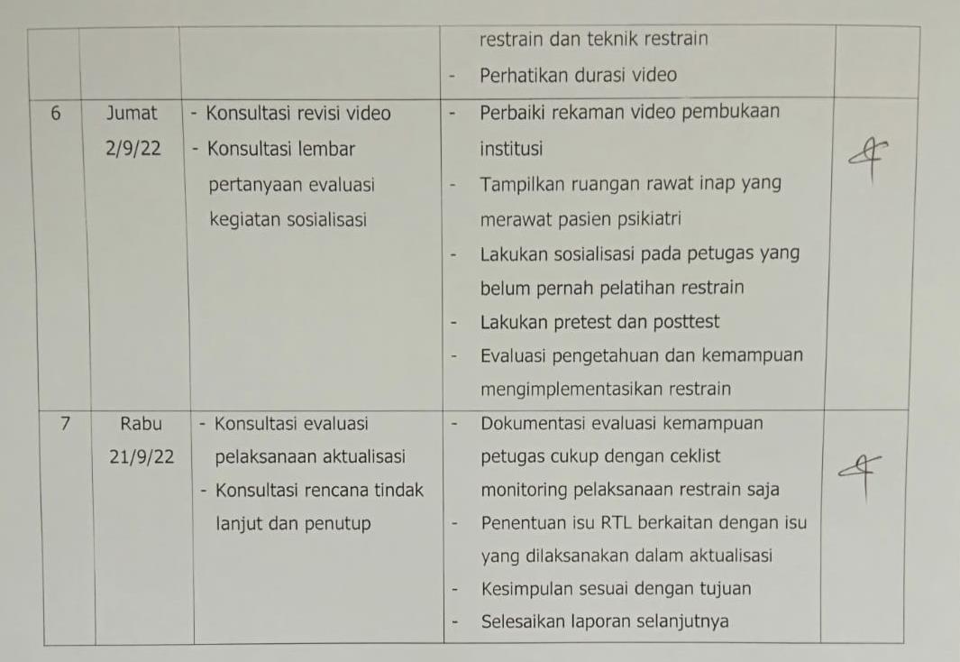 viii DAFTAR LAMPIRAN Lampiran 1 SOP Restrain Fisik.................................................................................... 83 Lampiran 2 Foto Bimbingan dengan Mentor................................................................. 85 Lampiran 3 Lembar Bimbingan dengan Mentor 86 Lampiran 4 Foto Bimbingan dengan Coach.................................................................. 87 Lampiran 5 Lembar Bimbingan dengan Coach ............................................................. 88 Lampiran 6 Lembar Pengesahan Rancangan Aktualisasi 89