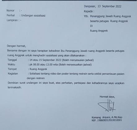3. Melakukan sosialisasi kepada keluarga/pendamping pasien yang dirawat dengan restrain di ruang Anggrek RSUP Prof.Dr.I.G.N.G.Ngoerah. Output dari kegiatan ini yaitu terlaksananya sosialisasi, foto kegiatan dan adanya daftar hadir sosialisasi. Tahapan kegiatan ini akan menginplementasikan nilai-nilai dasar PNS BerAKHLAK yaitu Berorientasi Pelayanan, Akuntabel, Kompeten, Harmonis, Adaptif dan Kolaboratif.