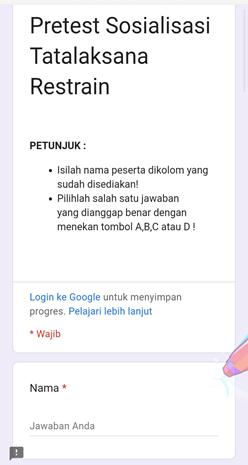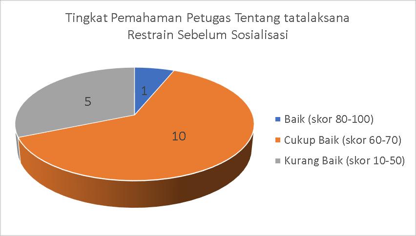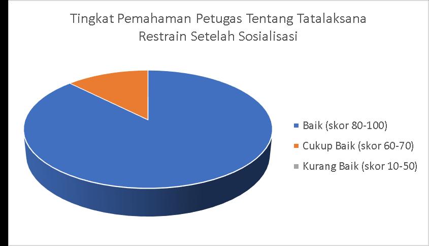 Hasil yang didapatkan dengan adanya sosialisasi dengan video dan poster tentang restrain ini yaitu terjadi peningkatan pemahaman tentang tatalaksana restrain yaitu dari 16 petugas yang diberikan sosialisasi, dengan hasil pretest terdapat 1 orang yang memiliki tingkat pemahaman baik, 10 orang memiliki tingkat pemahaman cukup baik dan 5 orang memiliki tingkat pemahaman kurang baik serta hasil posttest terdapat 14 orang yang memiliki tingkat pemahaman baik dan 2 orang memiliki tingkat pemahaman cukup baik. Dapat disimpulkan bahwa terdapat peningkatan yang signifikan pemahaman petugas tentang tatalaksana restrain setelah diberikan sosialisasi tentang tatalaksana restrain