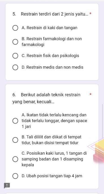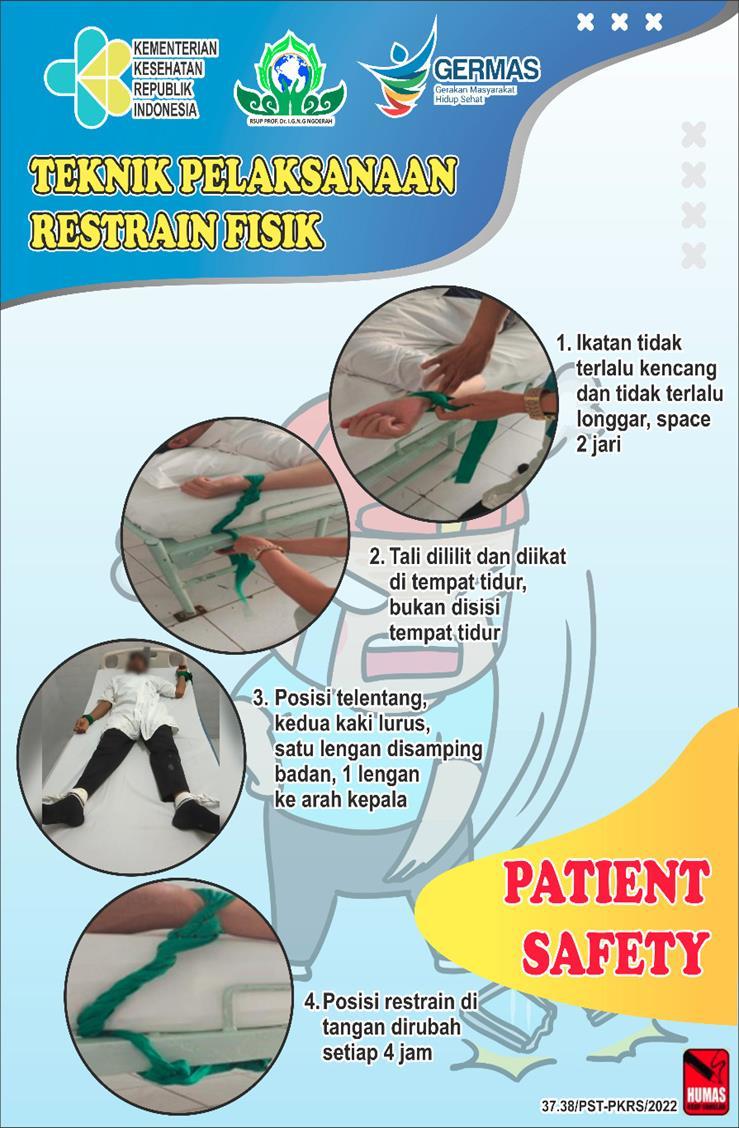 Penanganan kekerasan atau keadaan gaduh gelisah tersebut dapat dilakukan dengan cara restrain. Restrain terdiri dari 2 jenis yaitu restrain farmakologi dan non farmakologi (fisik). Restrain yang biasanya dilakukan oleh perawat yaitu restrain fisik. Restrain fisik adalah kekuatan fisik untuk membatasi kebebasan gerak dari individu tersebut, kekuatan fisik tersebut menggunakan alat medis dan tenaga manusia Restrain fisik menggunakan manset pada pergelangan tangan, kaki dan sprey untuk pengekangan. Untuk menjamin patient safety, alat restrain yang digunakan adalah alat yang aman dan tidak melukai, tali pada restrain dibuat dari kain yang diberi manset sehingga lembut dan kuat serta menghindari lecet pada bagian kulit yang dilakukan restrain (Narindrianisa, 2019).