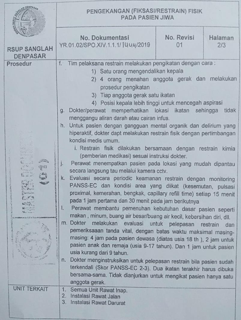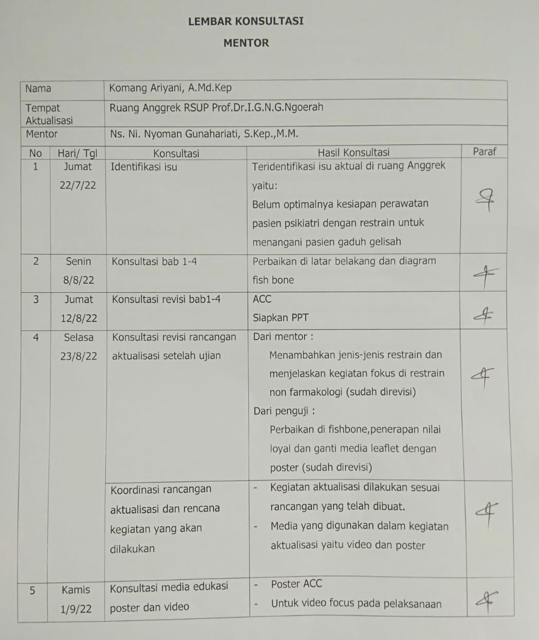 2 Kegiatan aktualisasi optimalisasi kesiapan perawatan pasien psikiatri dengan restrain untuk menangani pasien gaduh gelisah di Ruang Anggrek RSUP Prof. Dr. I.G.N.G. Ngoerah dengan output sudah menyediakan video dan poster tentang restrain sesuai SOP dan ceklist pemantauan pasien restrain untuk disosialisasikan kepada petugas di ruang Anggrek.