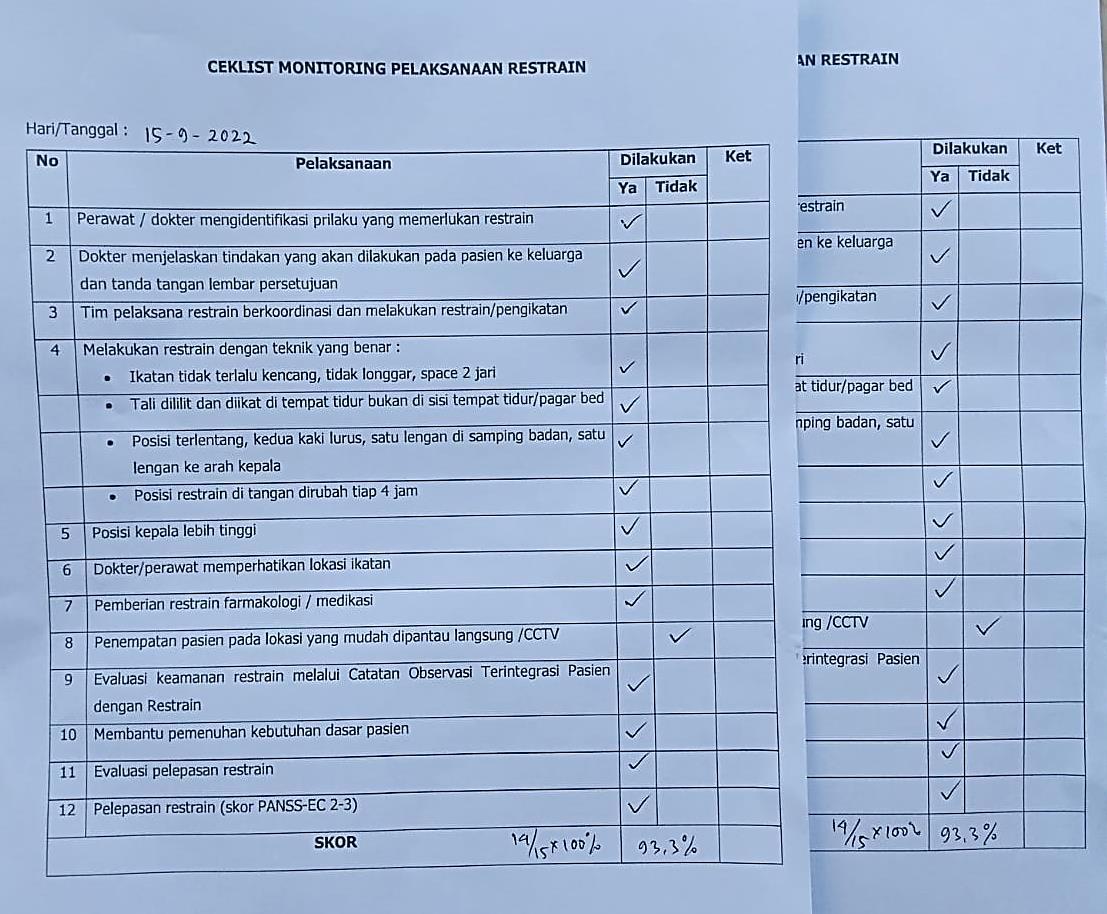 teknik yang kurang tepat dan belum mendokumentasikan monitoring pasien yang sedang direstrain, setelah diberikan sosialisasi petugas sudah melakukan restrain sesuai SOP dengan teknik yang benar dan sudah mendokumentasikan monitoring pasien dalam catatan observasi pasien dengan restrain.