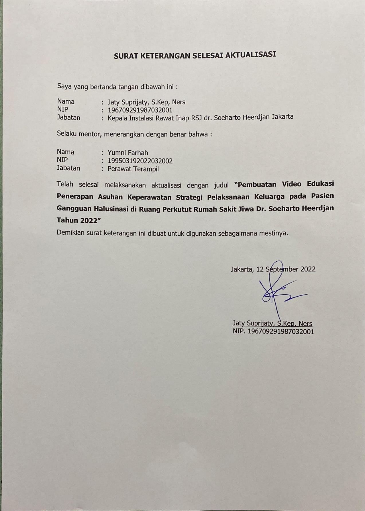 Setelahmelaksanakankegiatanaktualisasi,perlunyapengembanganlebihlanjutuntuk diberlakukannya penerapan asuhan keperawatan strategi pelaksanaan keluarga dengan gangguan halusinasi di Ruang Perkutut RSJ dr. Soeharto Heerdjan dengan menggunakan video edukasi melalui sticker yang telah terdapat QRCode bisa membantu pasien dalam proses perawatan saat kembali ke rumah