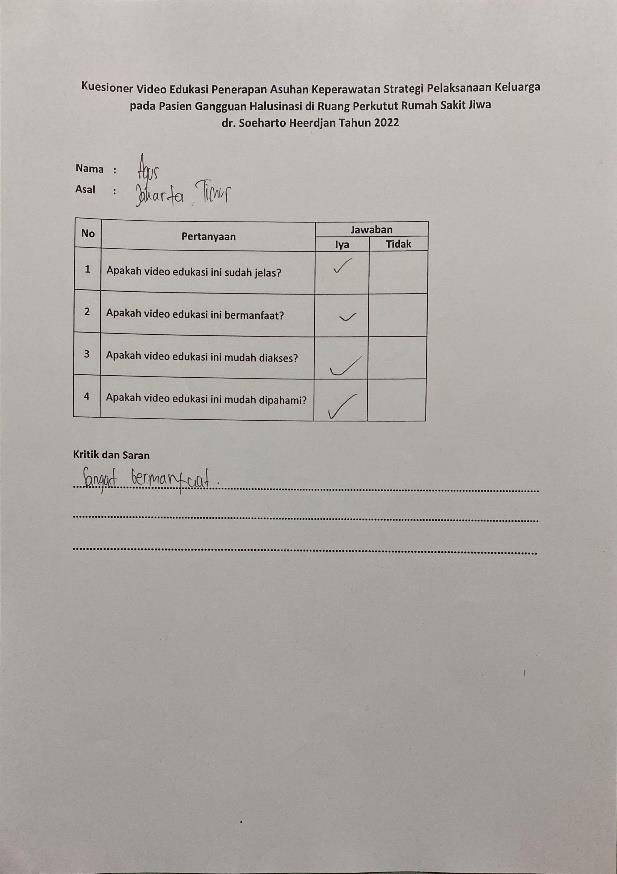 1. Menurut hasil survei melalui kuesioner, keluarga pasien menganggap bahwa video edukasi ini sudah jelas untuk menjadi pedoman merawat pasien dengan gangguan halusinasi saat pasien kembali ke rumah.