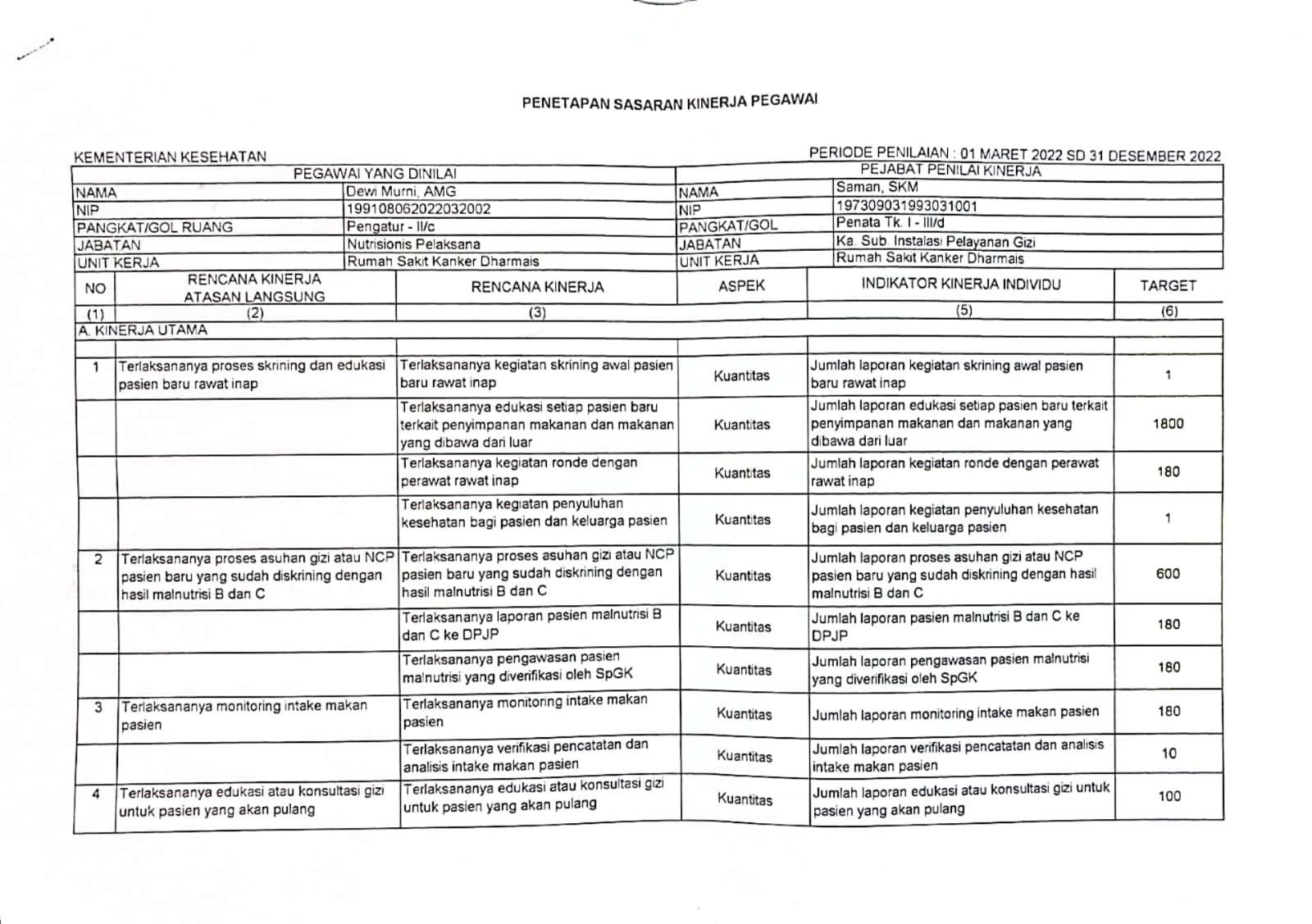 Lampiran 1. Sasaran Kinerja Pegawai 83 Lampiran 2. SPO Distribusi Makanan Pasien 85 Lampiran 3. Formulir Ceklis Identifikasi Diet Pasien oleh Petugas Pramusaji 86 Lampiran 4. PPT Sosialisasi Identifikasi Diet Pasien 87 Lampiran 5. Poster Identifikasi Diet Pasien 88 Lampiran 6. Formulir Ceklis Identifikasi Diet Pasien Oleh Petugas Pramusaji 90 Lampiran 7. Rekapitulasi Hasil Evaluasi Identifikasi Diet Pasien oleh Petugas Pramusaji Lantai 4 99 Lampiran 8. Rekapitulasi Hasil Evaluasi Identifikasi Diet Pasien oleh Petugas Pramusaji Lantai 5 101 Lampiran 9. Rekapitulasi Hasil Evaluasi Identifikasi Diet Pasien oleh Petugas Pramusaji Lantai 6 102 Lampiran 10. Rekapitulasi Hasil Evaluasi Identifikasi Diet Pasien oleh Petugas Pramusaji Lantai 7 105 Lampiran 11. Rekapitulasi Hasil Evaluasi Identifikasi Diet Pasien oleh Petugas Pramusaji Lantai 8 107 Lampiran 12. Lembar Pengesahan Rancangan Aktualisasi Optimalisasi Identifikasi Diet Pasien pada Petugas Pramusaji di Ruang Rawat Inap RS Kanker Dharmais Tahun 2022 109