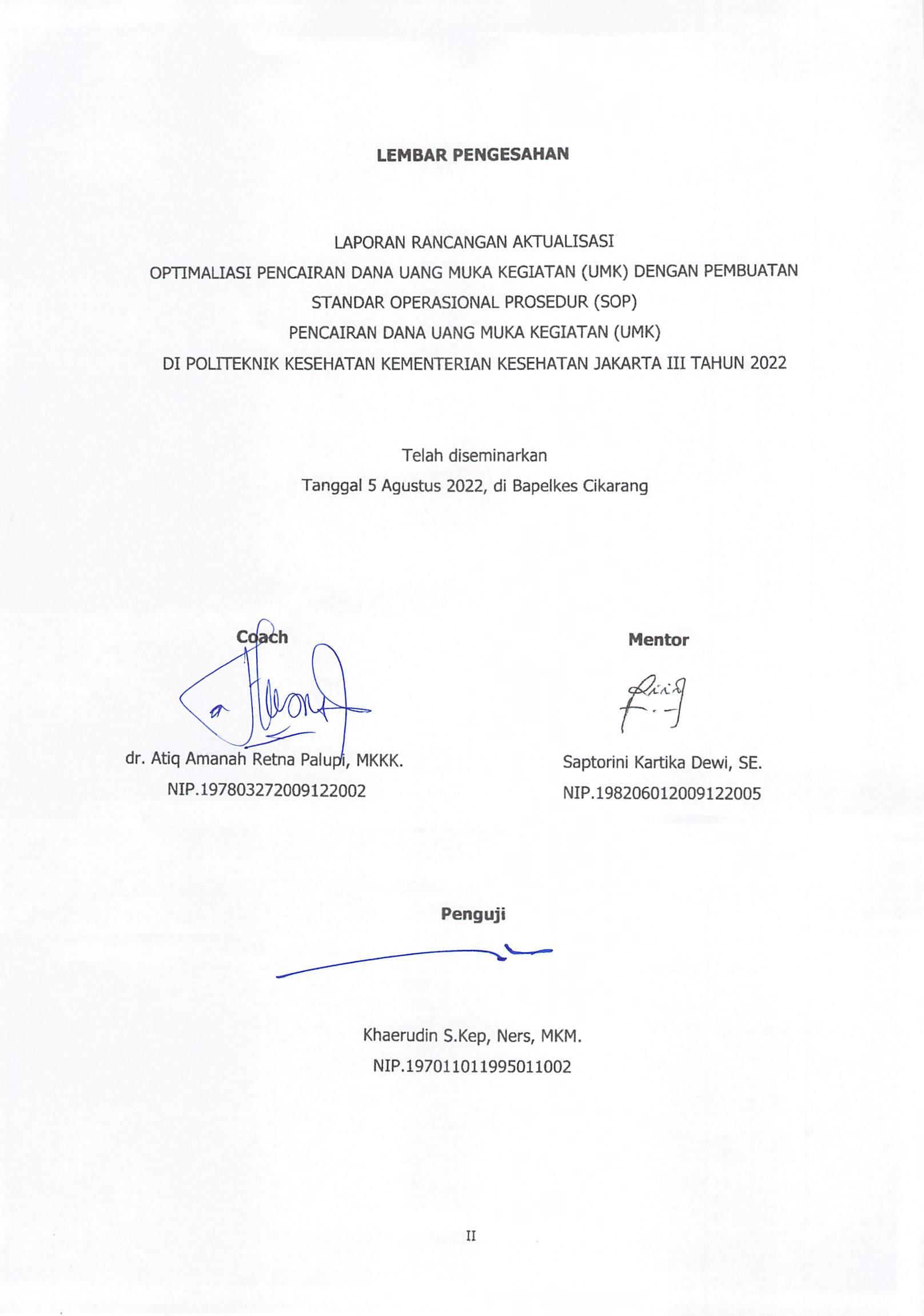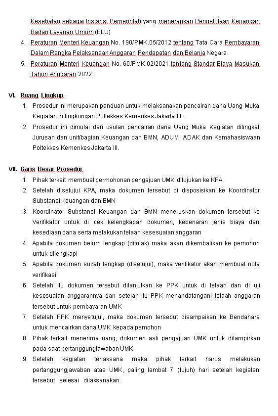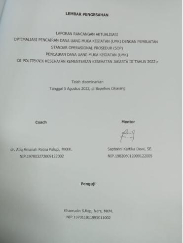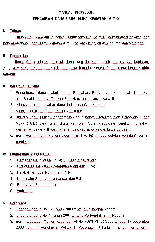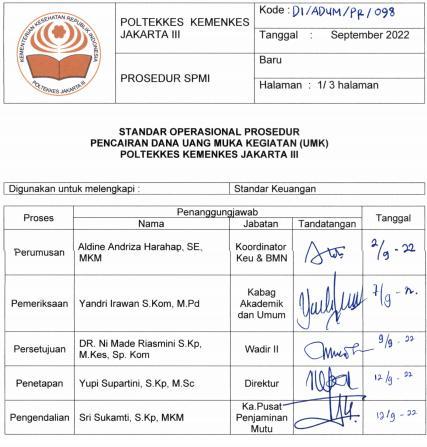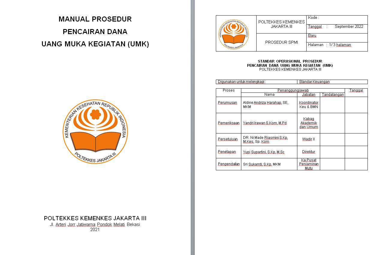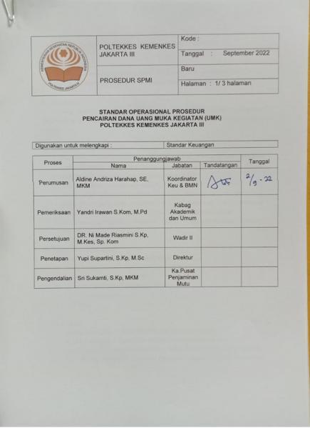 SaatinipelaksanaanpencairandanaUangMukaKegiatan(UMK)belumoptimalkarena masihbelumadanyaStandarOperasionalProsedur(SOP),haliniberdampakpadapencairan danaUangMukaKegiatanyangtidaktepatwaktudanakanberdampakpulapadakegiatan yangakandilaksanakanolehunitataujurusan.Makadariitupenulismengusulkanjudul “OptimalisasiPencairanDanaUangMukaKegiatan(UMK)denganPembuatan StandarOperasionalProsedur(SOP)PencairanDanaUangMukaKegiatan(UMK) diPoliteknikKesehatanKementerianKesehatanJakartaIIItahun2022”.