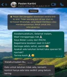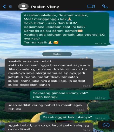 2.Dalam meminta persetujuan pasien dan keluarga untuk dihubungi melalui aplikasi whatsapp, saya mengutamakan kepuasan pasien dengan bersikap ramah dan sopan saat meminta persetujuan pasien (Berorientasi pelayanan) dan selalu menampilkan kinerja terbaik dalam pekerjaan dengan selalu membantu pasien dan keluarga untuk merawat luka post SC (Kompeten)