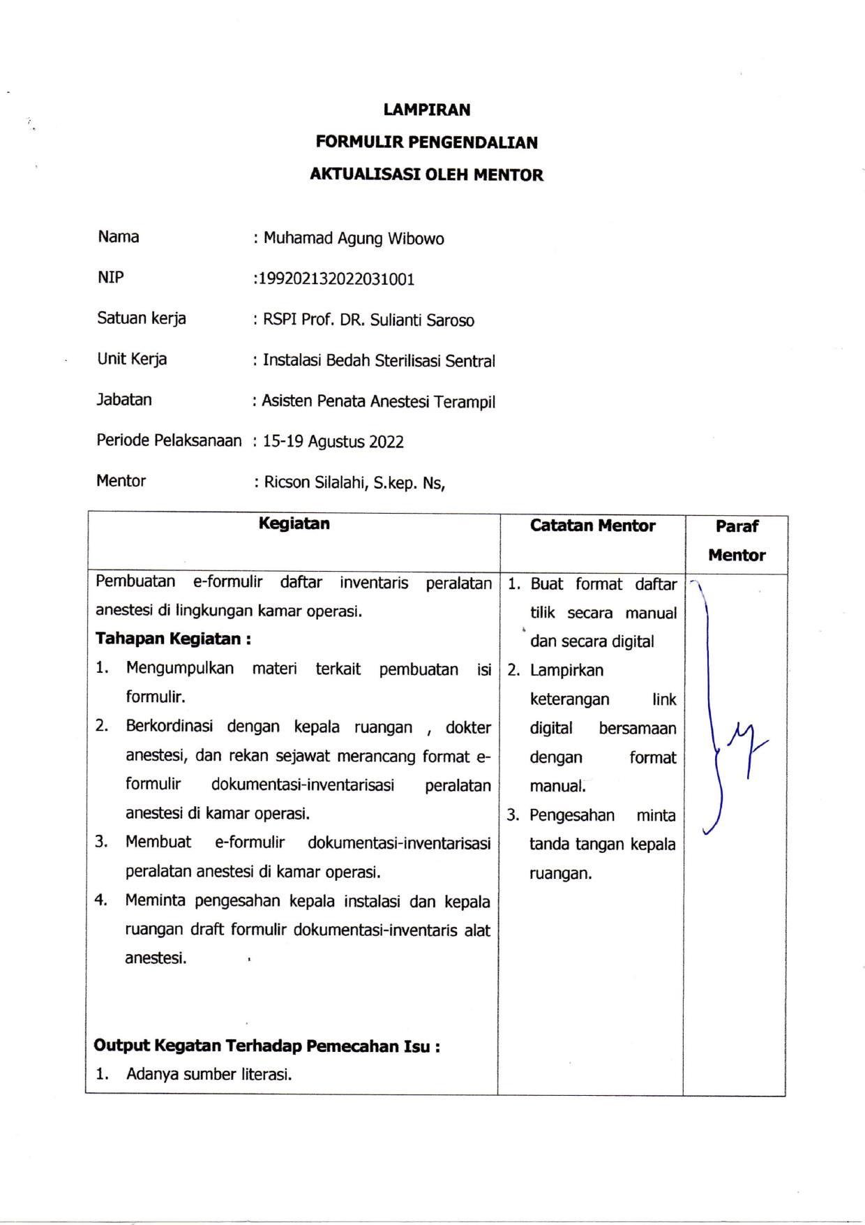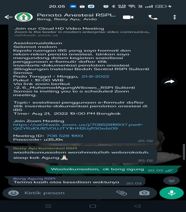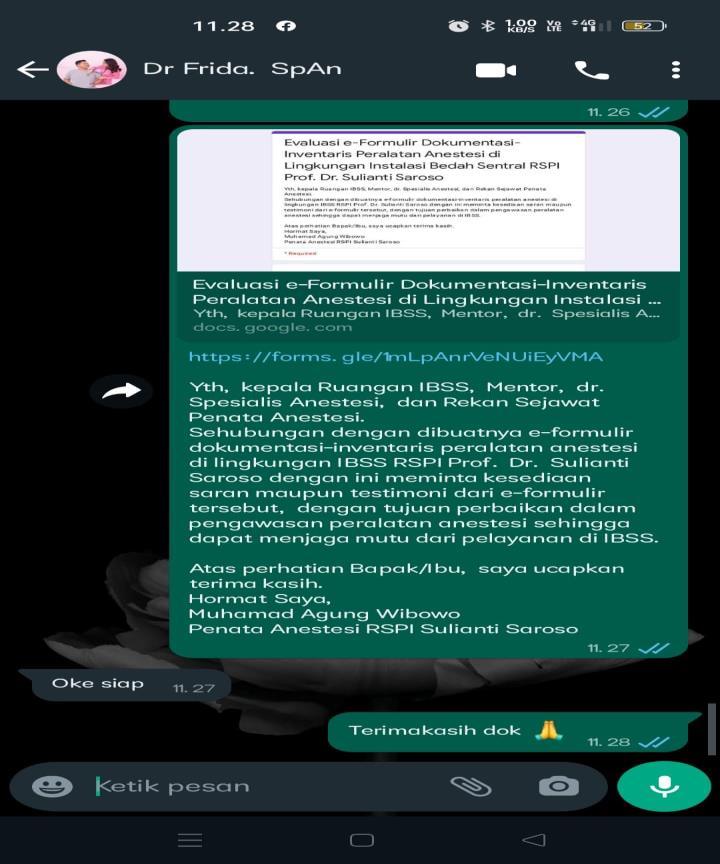 terkait kelanjutan penggunaan e-formulir untuk mendokumentasikan dan inventaris peralatan anestesi dilingkungan IBS RSPI Prof. DR. Sulianti