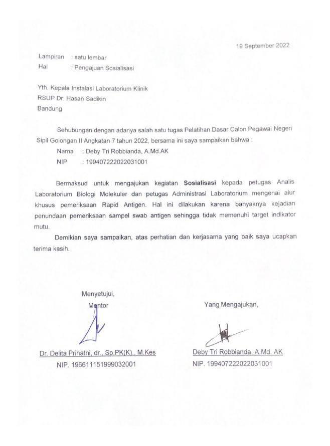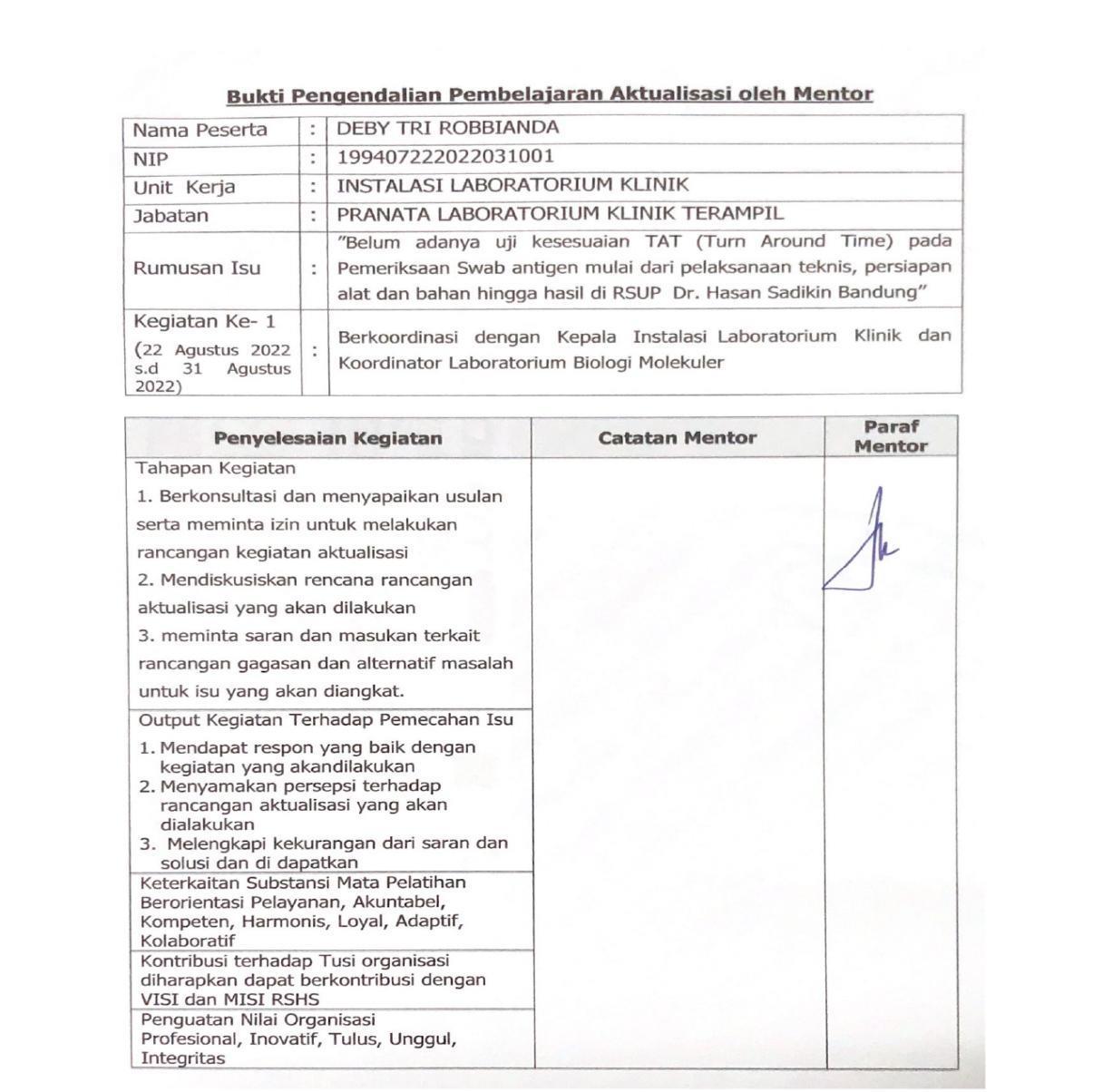 b. Waktu pelaksanaan aktualisasi akan dilaksanakan mulai tanggal 22 Agustus - 30 September 2022 di Instalasi Laboratorium Klinik RSUP Dr. Hasan Sadikin Bandung.