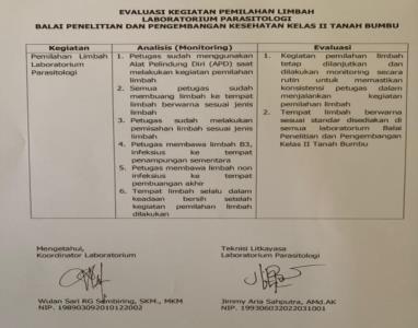 Diharapkan agar kedepannya kegiatan pengelolaan limbah dapat diterapkan secara konsisten dan berkelanjutan di laboratorium parasitologi, serta dapat pula ikut diterapkan di setiap laboratorium lainnya di Balai Penelitian dan