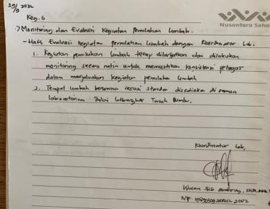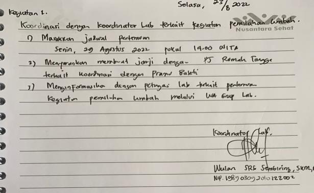 Monitoring lanjutan kegiatan pemilahan limbah oleh petugas Adanya data monitoring lanjutan kegiatan pemilahan limbah Oktober-Desember 2022 Petugas laboratorium dan pramu bakti Tidak ada Monitoring menggunakan form dan checklist monitoring kegiatan pemilahan limbah