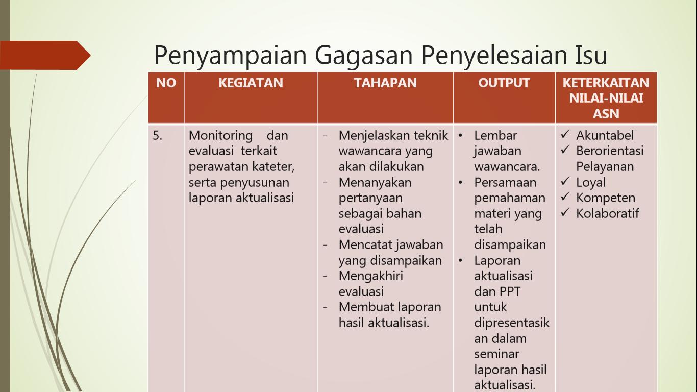 Survei CDC pada tahun 2015 mengatakan bahwa pemasangan kateter pada pasien dapat meningkatkan resiko terjadinya infeksi saluran kemih (ISK). Oleh karena itu pentingnya melakukan perawatan kateter agar tidak terjadi resiko terjadinya infeksi saluran kemih. Berdasarkan pemaparan di atas, maka penulis merasa perlu dilakukan kegiatan rancangan aktualisasi dengan judul “OPTIMALISASI PERAWATAN