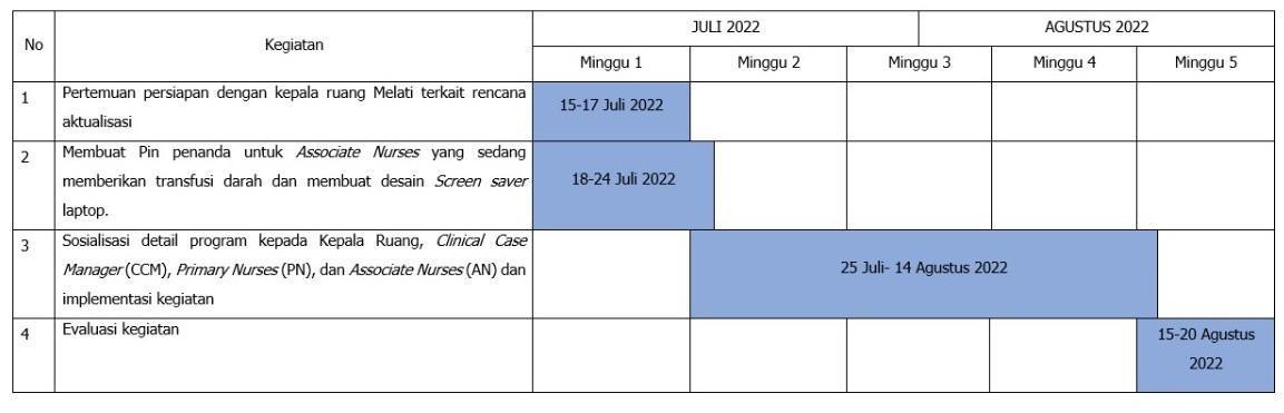 3 Sosialisasi detail program kepada Kepala Ruang, Clinical Case Manager (CCM), Primary Nurses (PN), dan AssociateNurses(AN) dan implementasi kegiatan.