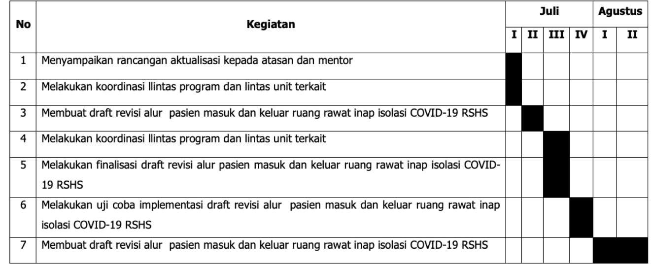 Tujuan khusus aktualisasi yaitu tersusunnya draft revisi alur pasien masuk dan keluar ruang isolasi COVID-19 RSUP Dr. Hasan Sadikin Bandung.