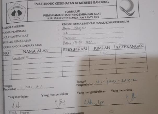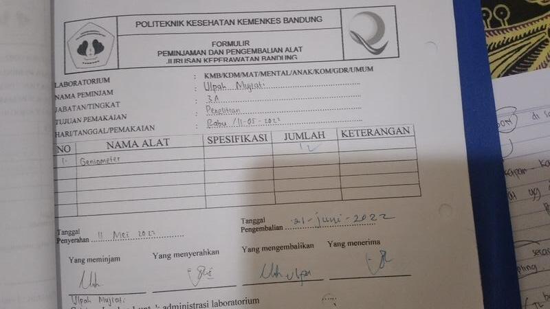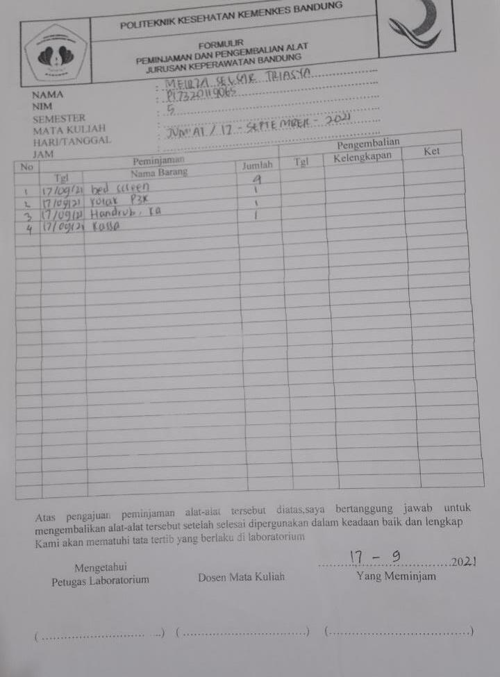 meningkatkan pelayanan laboratorium pendidikan Melalui Optimalisasi Peminjaman Alat dan Bahan Praktik menggunakan Formulasi Digital di Jurusan Keperawatan Poltekkes Kemenkes Bandung Tahun 2022.