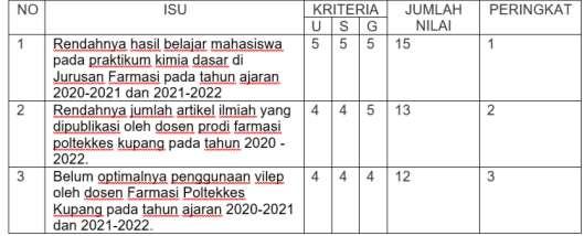 USG diterapkan terhadap ketiga isu dengan memperhatikan urgency, seriousness, dan growth. Dalam analisis ini, isu pertama adalah rendahnya hasil belajar mahasiswa pada praktikum kimia dasar pada tahun ajaran 2020-2021 dan 2021-2022 memberikan poin terbesar dibanding 2 isu lainnya. Tambahan lagi, isu ini dapat berdampak pada ketidaktuntasan nilai kelulusan matakuliah sehingga tidak tercapainya kompetensi mahasiswa berdasarkan capaian pembelajaran. Bahkan hal ini dapat membuat tidak tercapainya IKU Poltekkes Kemenkes Kupang.